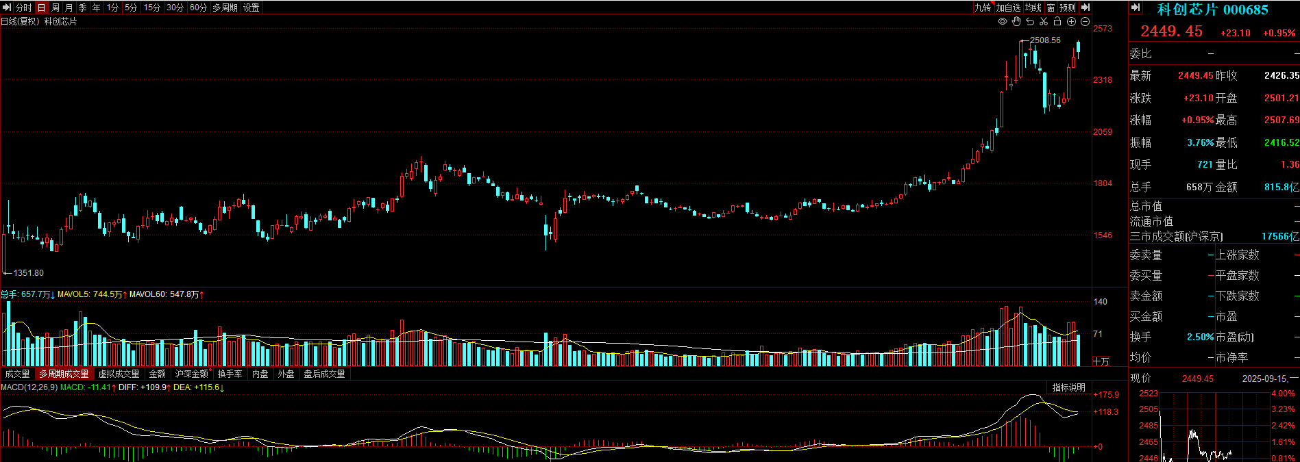 科创芯片高开低走,短期行情有回踩5日均线的需求,但多头趋势不变,所以即使是回踩了,我依然觉得是机会,所以当下我会继续格局。