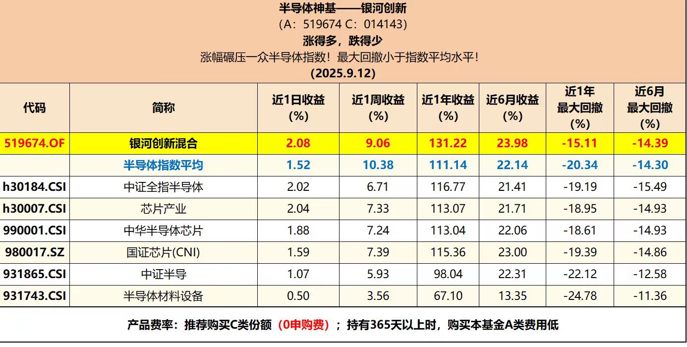 宝子们下午好呀,今天市场确实偏震荡,其实昨晚复盘的时候小小就提到过,近期要有震荡的心理准备,震荡是震荡,趋势是向上。只要满足这一特点,再搭配上周线视角去格局,就不输,这是4/8以来小小一直实践、并且成功了的策略。半导体方面,今天大幅高开之后冲高回落,但是小小持有的半导体基金$银河创新成长混合C(OTCFUND|014143)$,今天股指还是大涨逾2%,近一年收益率又来到了130%,每个时间维度的收益性和抗回撤性相对来说,都是同类top的水平,也大幅强于半导体指数的表现,不愧是半导体大佬郑巍山,任职以来经历了好几个半导体的周期,在半导体领域有深入研究和长期坚守,任职期间这只基金大涨236%,而且这只特点比较鲜明,前十大重仓股都集中在半导体领域,风格聚焦程度高。当前,人工智能、半导体等领域是未来科技发展的重要方向。AI带来的新需求以及传统半导体产业周期的复苏,都为相关企业的发展提供了机遇。同时,中国半导体国产替代也在进行中,行业长期发展潜力较大,所以小小还是打算继续拿着~坐稳扶好~