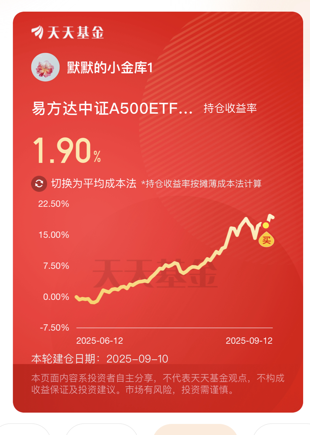 今天股市震荡,行业轮动快,我还是倾向保守策略。中证500指数表现稳健,年内涨了不少,宽基指数分散风险的特点在当下很有优势。我手里的$易方达中证A500ETF联接C(OTCFUND|022460)$,目前持有收益率1.90%,这只基金跟踪的指数涵盖多行业,走势平稳,业绩也不错,适合在震荡市中布局,期待能带来稳定收益。
