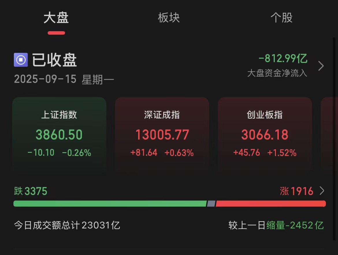 9月15日,A股三大指数涨跌不一,全市场成交量较上一日缩量约2500亿,赚钱效应较弱。市场呈现“深强沪弱、成长优于价值”的结构性特征,资金持续聚焦高景气赛道,短期情绪偏乐观,但指数层面仍处震荡区间,需关注政策兑现与基本面匹配度。港股市场集体走高,在美联储降息预期这一核心催化剂作用下,市场风险偏好提升,科技股主导反弹,南向资金持续流入,港股科技板块补涨明显。