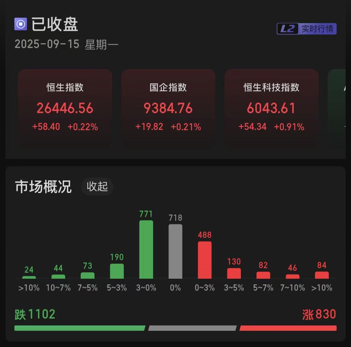 恒生指数上涨0.22%,国企指数上涨0.21%,恒生科技指数上涨0.91%。830只个股上涨,1102只个股下跌。南向资金,净买入144.73亿港元。