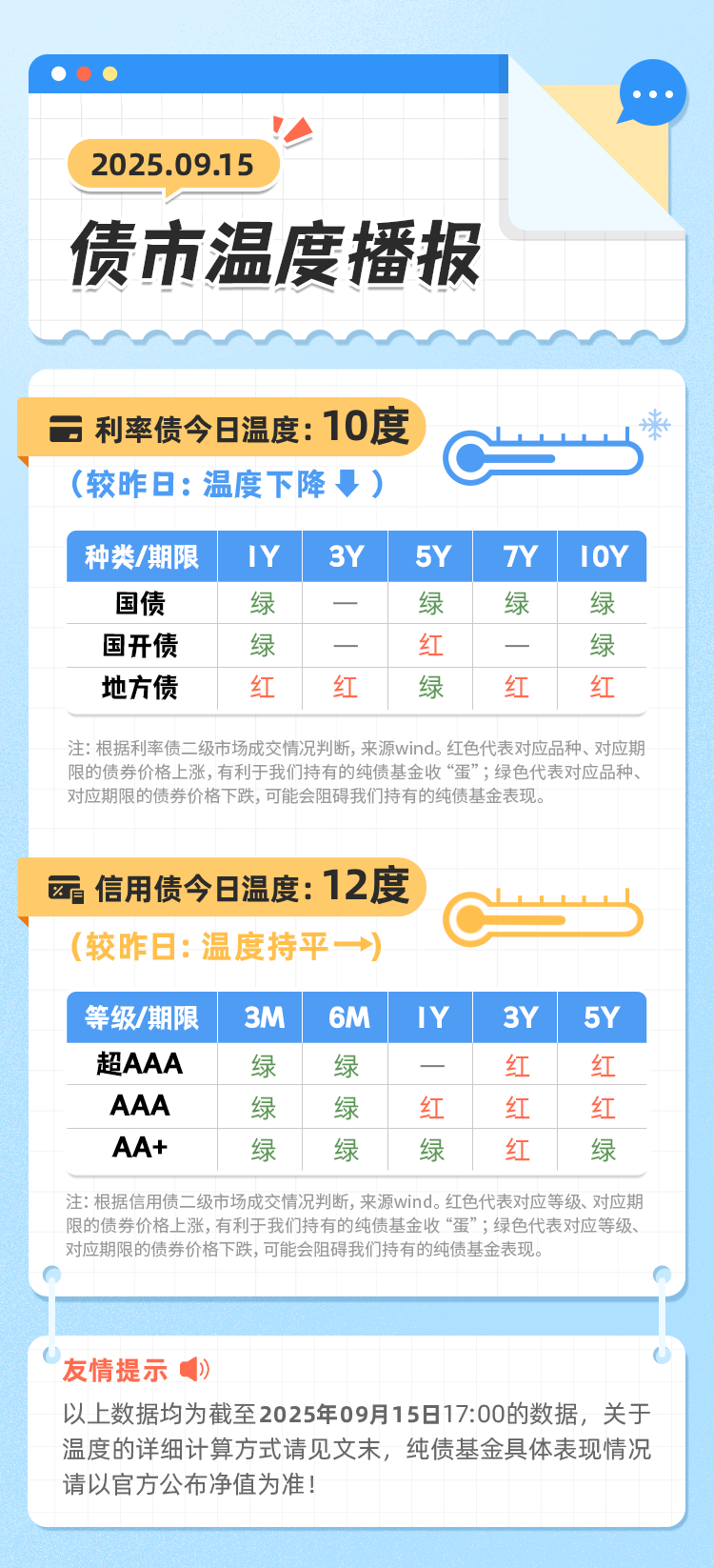 温度设定从0度开始,1个红色格子=温度提升2度。假设当天信用债市场的15格子中,有5个格子是红色,10个格子是绿色,那么当天信用债市场的温度为10度,利率债温度计算同理。