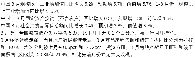 上周五公布了8月最新的宏观经济数据,情况一般,整体略低于预期。