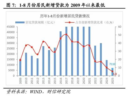 大家还是不愿意贷款。新增人民币贷款5900亿元,同比少增3100亿元,预期增6144.29亿元。消费贷仅新增100亿元,同比少增611亿元。居民1-8月的新增贷款创09年至今新低,全民化债依旧是未来相当一段时间的宏观经济底色。