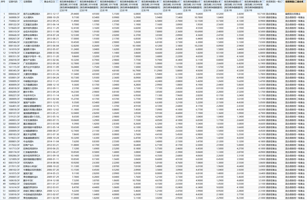 确实是有的,我们在数据库里筛选了一下,首先成立十年以上的基金就只剩一小部分(一万多只基金里筛出1300多只),在这里面年年正收益的,排除货币基金和纯债基金之后,混债基金(包括一级债基、二级债基、偏债混合三类)有53只,如下图。