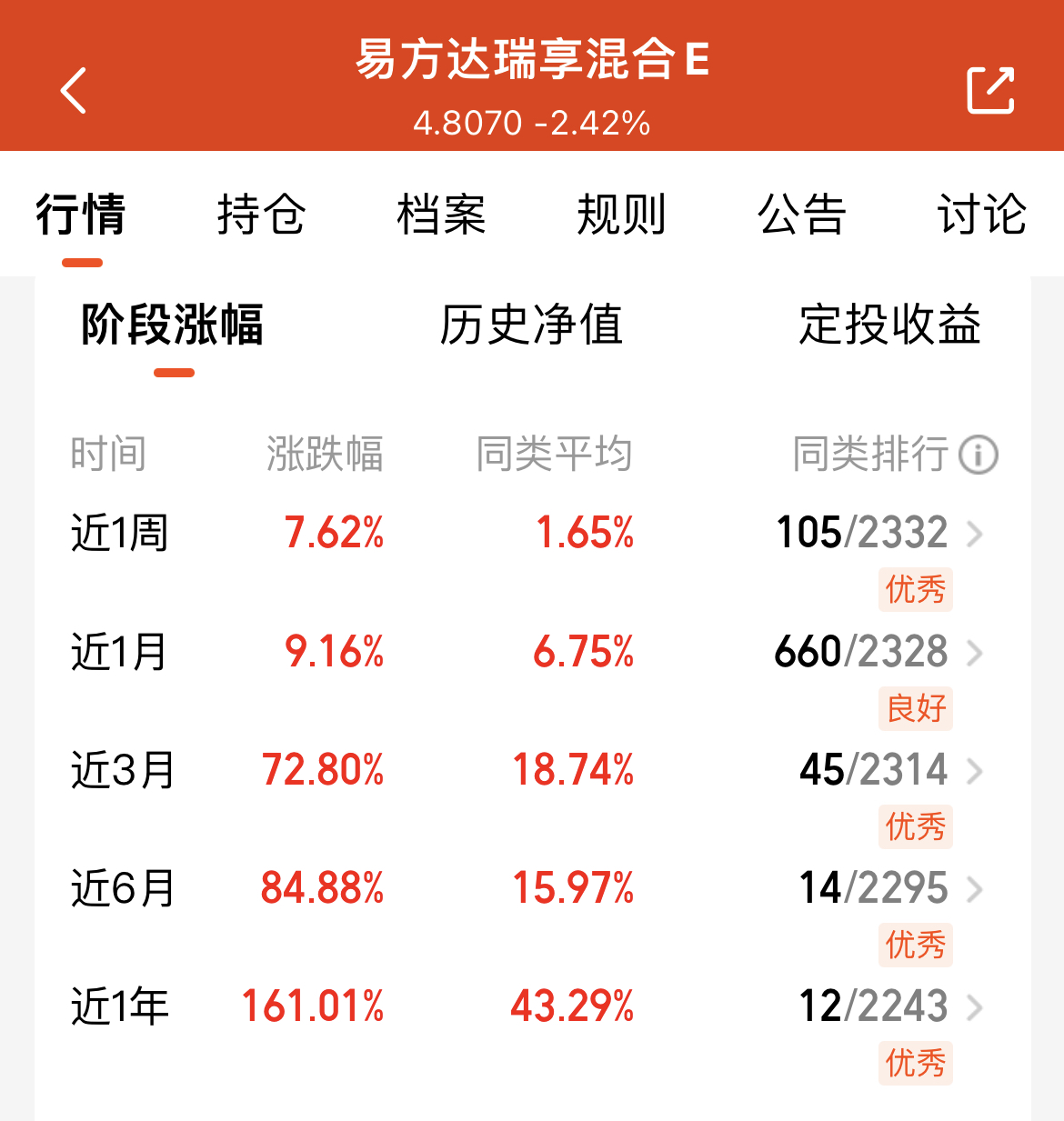 CPO行情最近又火起来了,$易方达瑞享混合E(OTCFUND|001438)$表现特别亮眼,9.10号单日涨幅超10%,把竞品都甩在后面。基金经理眼光准,早早布局成长板块,拿超额收益很有一套。这只基成立以来累计收益超380%,调仓又快又准,长期业绩没话说,想参与CPO行情,这款就不错的。
