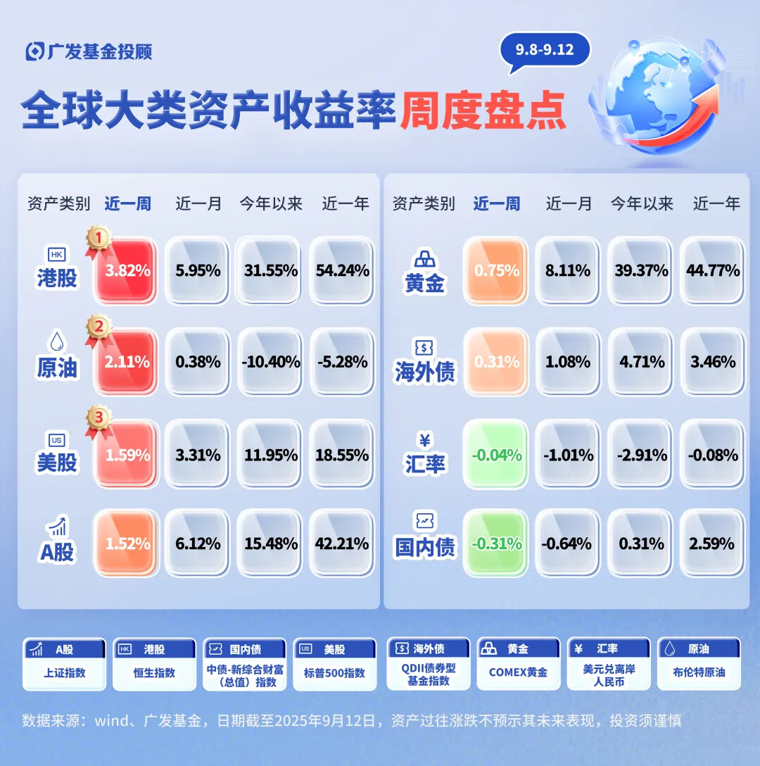 上周,港股市场表现强劲,恒生指数周涨3.82%,恒生科技指数周涨5.31%,位居全球大类资产前列。