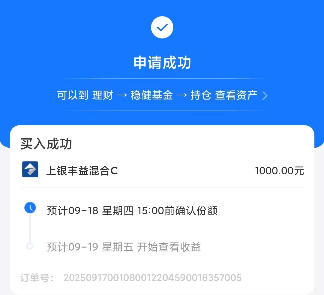 9月以来大家都有什么操作呢?从目前市场行情来看稳健资产开始企稳回暖,要知道上个月债市经历了一轮深度调整后,现如今反而是低位布局稳健资产不错的机会。像我今天准备配置的$上银丰益混合C(OTCFUND|011505)$昨天就收涨19个蛋,反弹发力开始爆大蛋了,所以今天我准备跟着靠谱固收+吃肉咯。