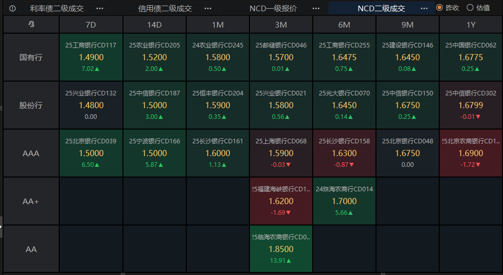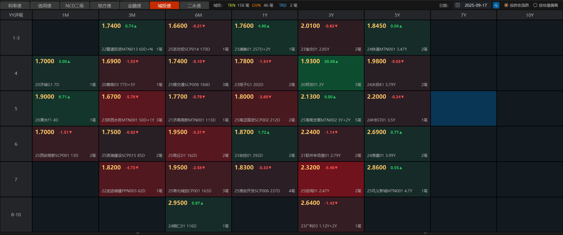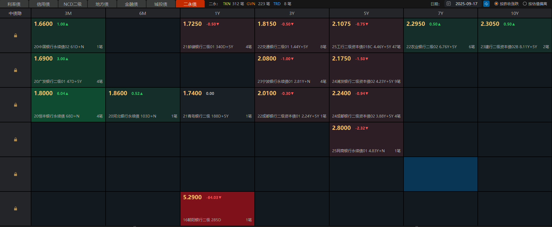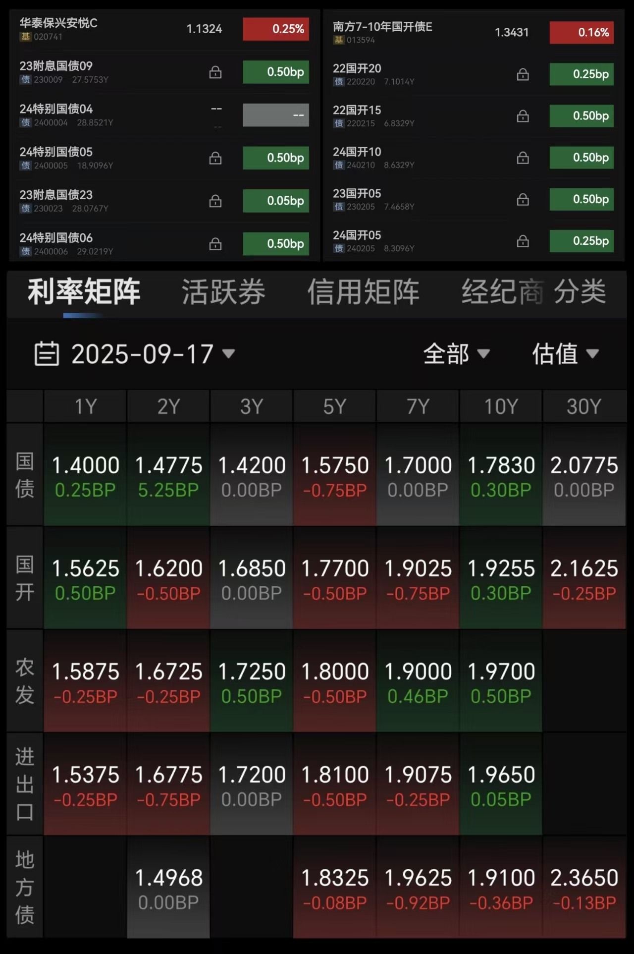 09月17日债市午间天气播报:今天还是隔壁大盘更强势,盘中虽有震荡,但很快又拉起来了。证券也开始发力了,个股有2900多家上涨,可转债晴天。债市这边,基金是买方主力,证券是卖方力量。上半场观望,具体走势要看下午了。目前利率债中短端优于长端,整体窄幅波动;信用债开启修复模式,多数小幅上涨,不过城投债长端和银行债短端仍有小部分下跌。午间情况:7-10年期国开债碎蛋3-5个,超长期国债轻仓碎蛋7-9个(华子),重仓碎蛋10+个蛋(方正)。