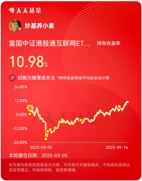 各位兄弟姐妹们!今天大盘挺热闹,创业板涨1.7%,芯片、机器人满天飞,港股互联网也支棱起来了!麦爸持有的$富国中证港股通互联网ETF发起式联接C(OTCFUND|014674)$,昨天小回调一下,今天目前涨了2.81%,算了下,今天这一根阳线差不多能把前两天的回调一口吞了;