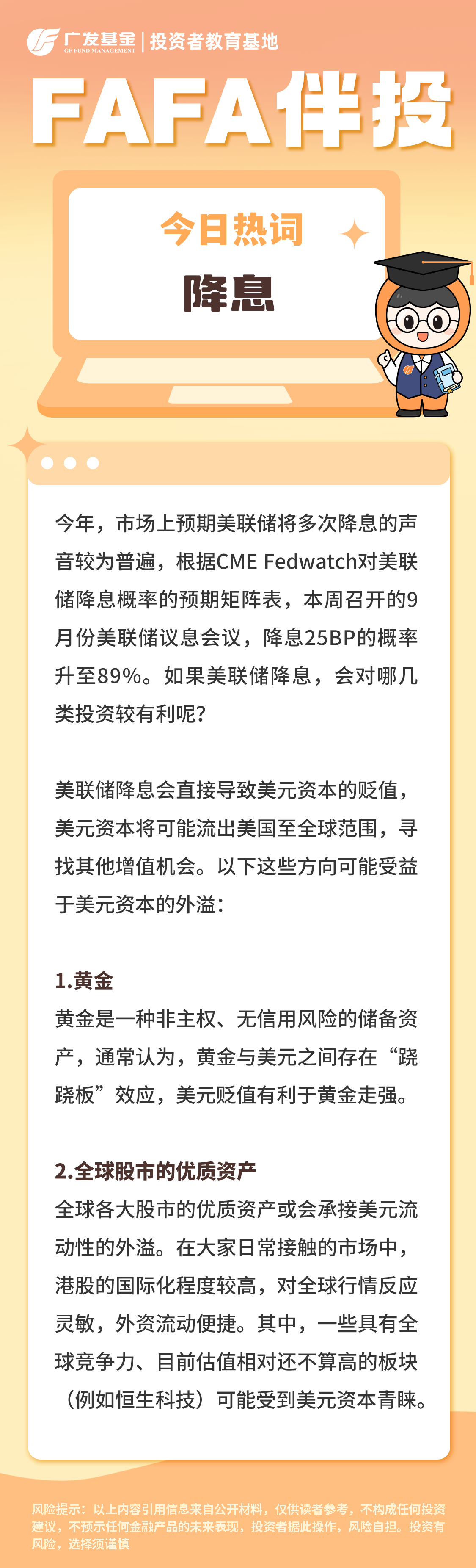 $广发上海金ETF联接A(OTCFUND|008986)$$广发上海金ETF联接C(OTCFUND|008987)$$广发全球精选股票(QDII)人民币C(OTCFUND|021277)$$广发全球精选股票(QDII)人民币A(OTCFUND|270023)$$广发恒生科技ETF联接(QDII)A(OTCFUND|012804)$$广发恒生科技ETF联接(QDII)C(OTCFUND|012805)$$广发港股通科技ETF联接A(OTCFUND|025197)$$广发港股通科技ETF联接C(OTCFUND|025198)$$广发港股创新药ETF联接(QDII)A(OTCFUND|019670)$$广发港股创新药ETF联接(QDII)C(OTCFUND|019671)$#鲍威尔暗示或9月降息!市场影响几何?#