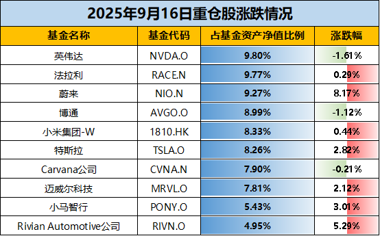 【十大持仓】根据最新披露的基金定期报告,截至2025年二季度末,华宝海外新能源汽车前十大重仓股包括英伟达、法拉利、蔚来、博通、小米集团-W、特斯拉、Carvana公司、迈威尔科技、小马智行、Rivian Automotive公司,占基金资产净值比例合计为80.51%。
