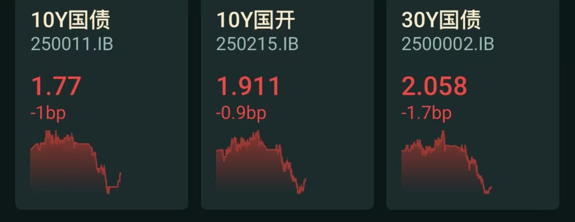 10年期国债活跃券收益率:下行1bp,报1.77%;
