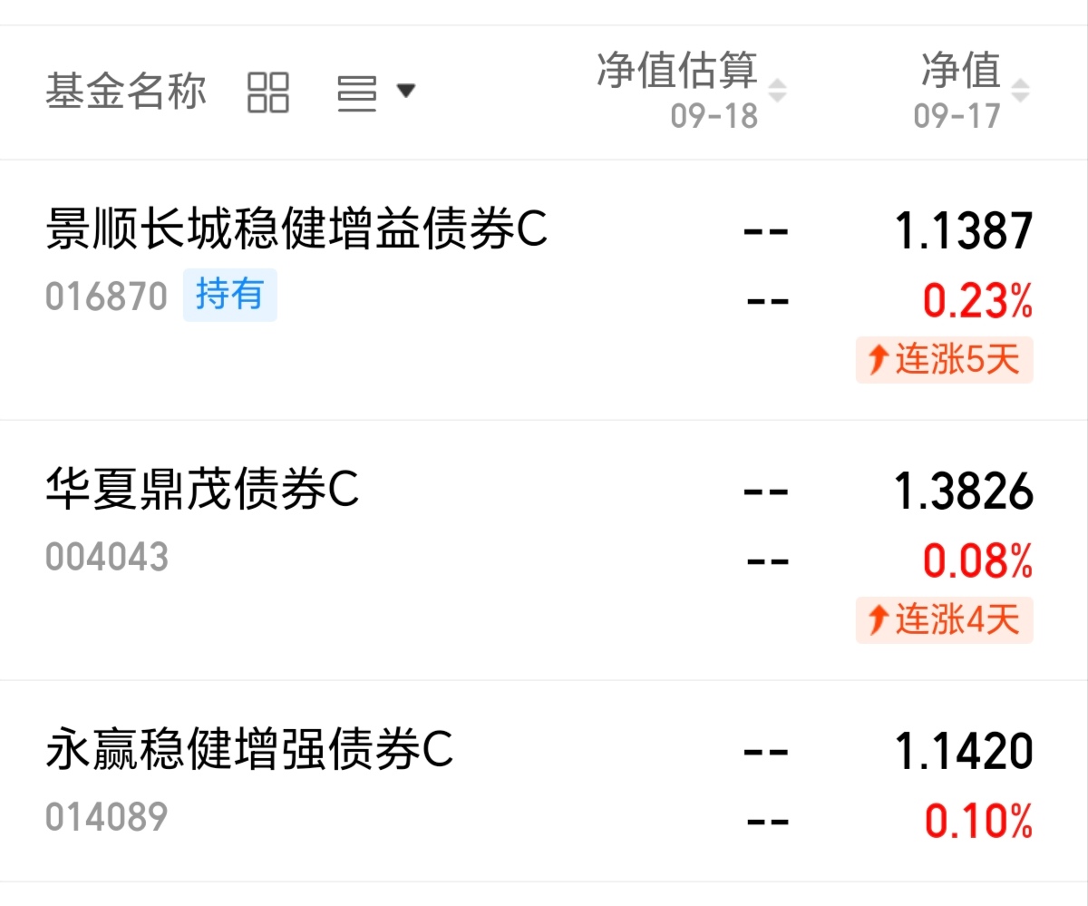 近期股债行情都走出独立趋势,混债、纯债都有着不错的收益,而我一直持有的$景顺长城稳健增益债券C(OTCFUND|016870)$昨天更是收获23个大蛋,不但涨幅力度优秀,并且连续上涨5天,不愧是加了股票的固收+,这持有感受真的是太香了!