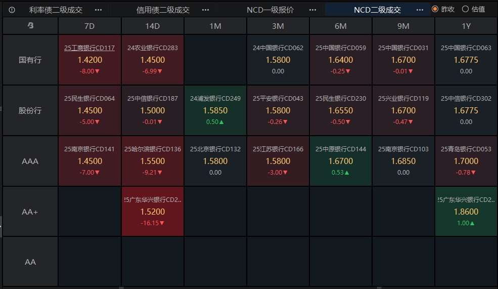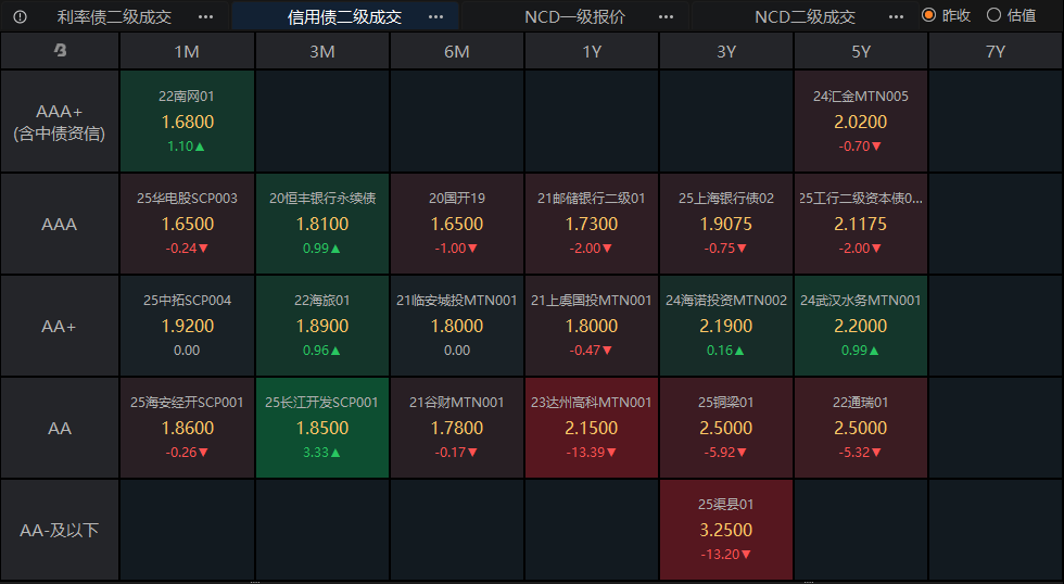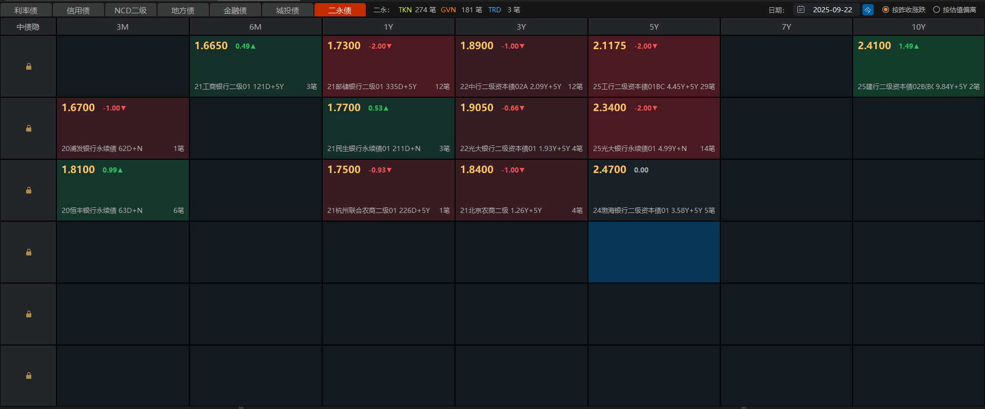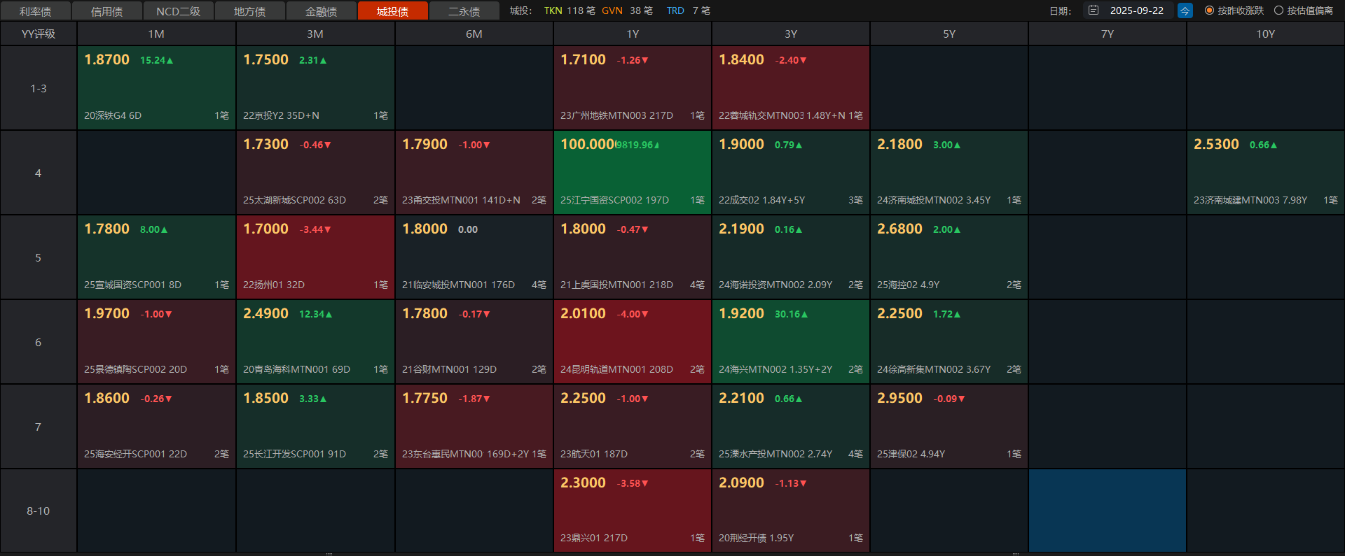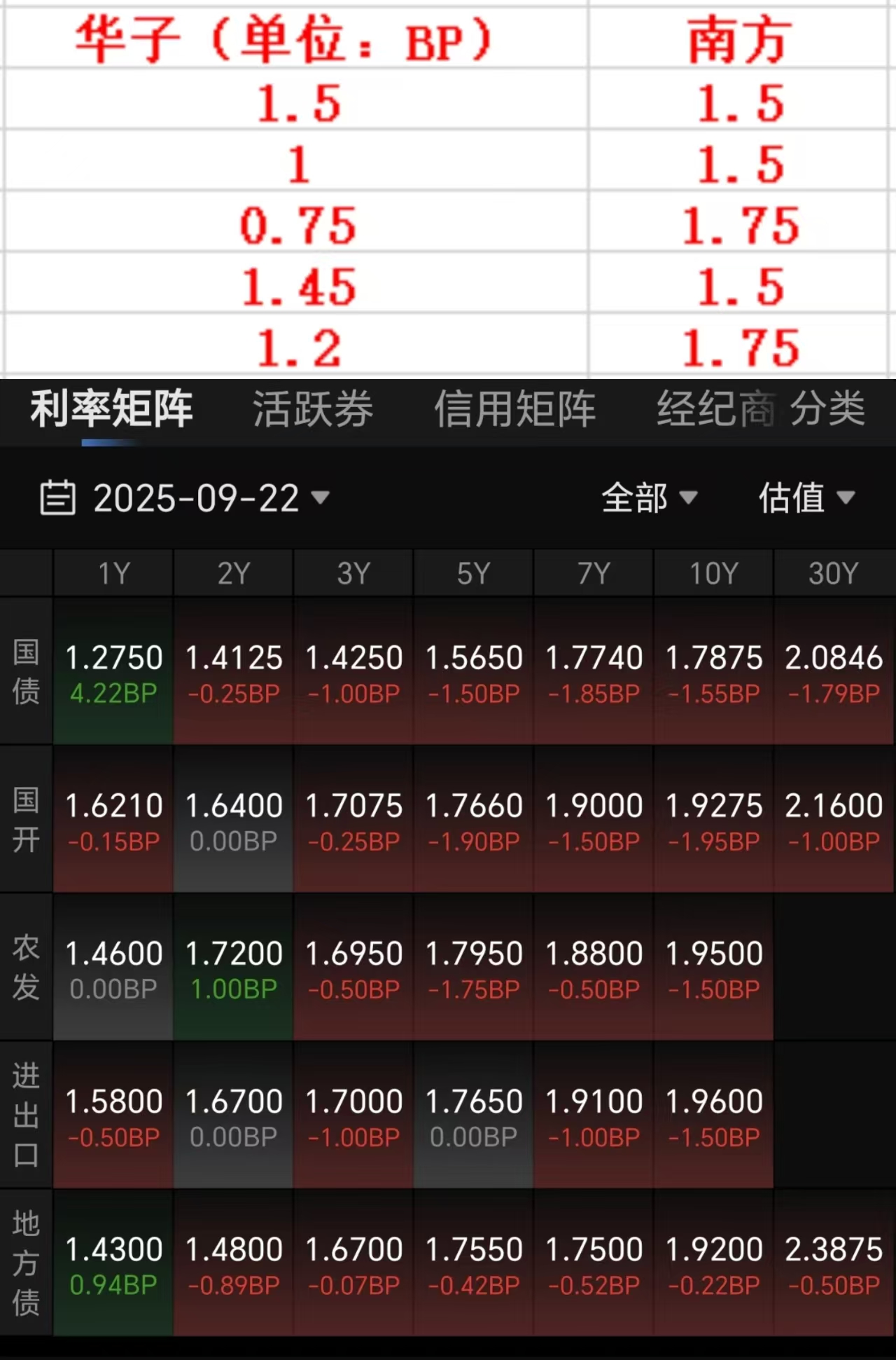 09月22日债市午间天气播报:上半场结束,隔壁盘整,个股3400多家下跌。但是科技板块持续发力,强者恒强,科创芯片延续强势。可转债依然不佳,但跌势有所收窄。债市这边,证券目前是买方主力,基金和银行反而是卖方力量。要知道上周五就是因为证券卖出才导致利率债大幅下跌,所以下午证券的动向是关键。信用债整体表现尚可,叠加周末票息小蛋行情。午间情况:7-10年国开债收蛋15个左右,超长期国债轻仓收蛋20个左右(华子),重仓收蛋23-29个(方正、丰和)。