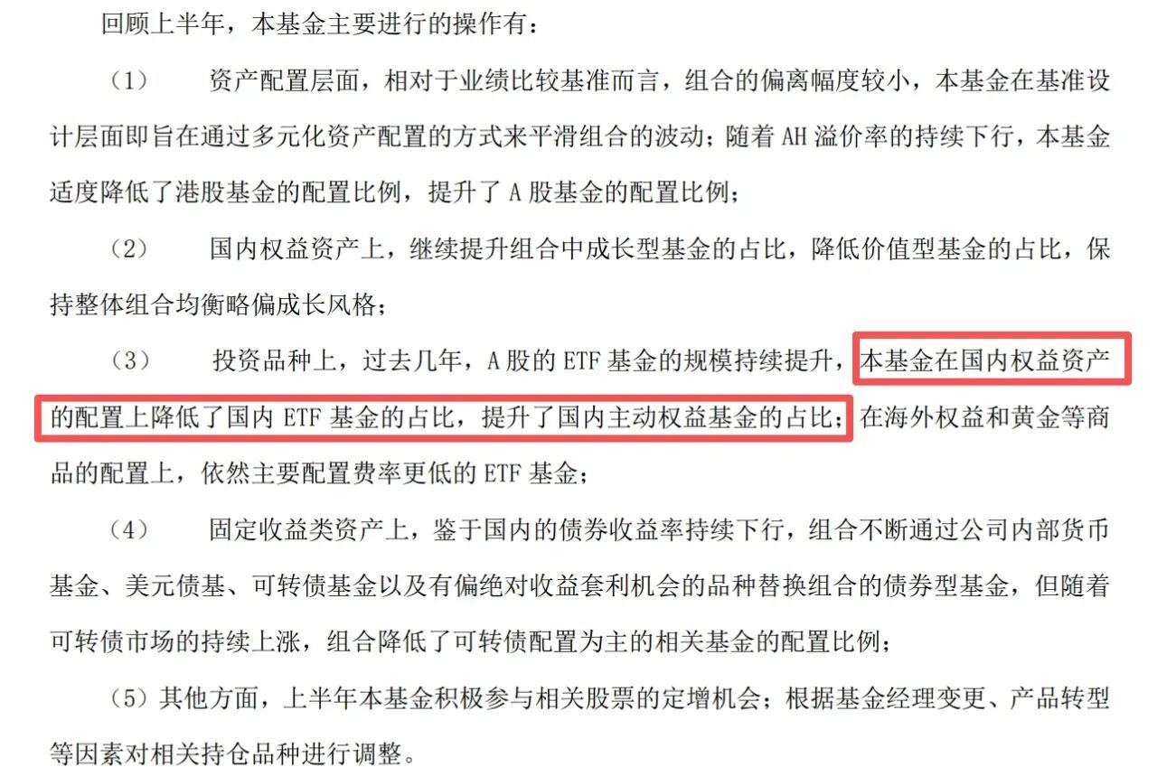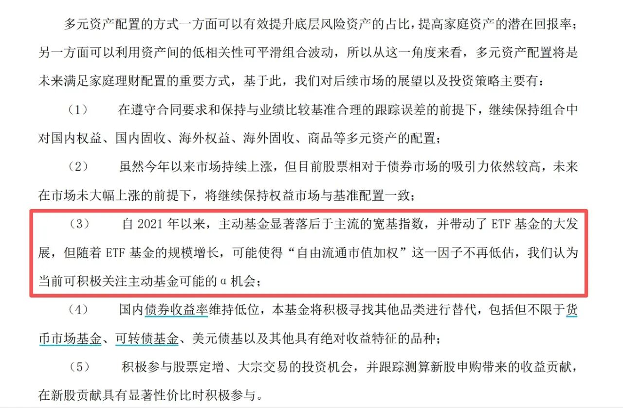 现在基金的中报也出了一段时间了。基金中报有非常全的资金投资的方向、品种,以及对于上半年的回顾和下半年的展望。我周末又抽空看了几份FOF的中报,其中有好几支FOF的基金里都有提到,今年上半年开始增加了对于主动权益基金的配置。这个在过去三年是很罕见的,今年主动权益相较于被动指数的超额再次回归,敏锐的机构资金已经提前感知。