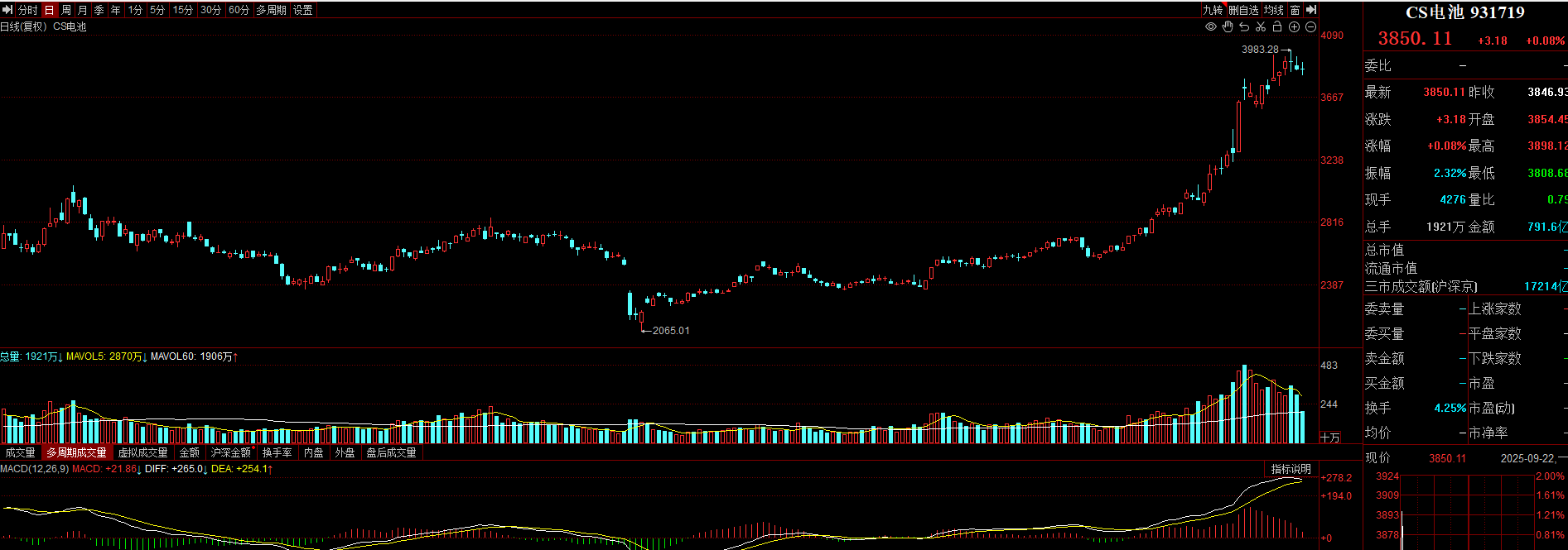 电池震荡走低,日K线已经下穿5日均线的支撑,短期行情有回撤的风险,如果尾盘不能拉升,我可能会考虑做减法。