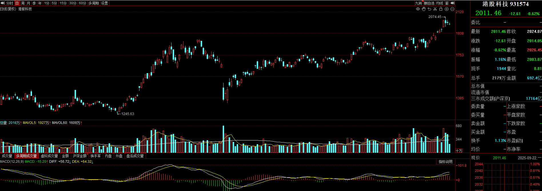港股科技在5日均线附近窄幅震荡,目前多头反弹趋势不变,关注5日均线的支撑,关注10日均线的防守位置。