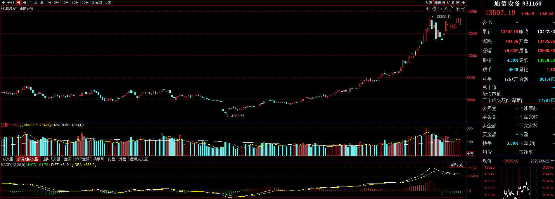 通信设备窄幅震荡,目前指数微微翻红,关注5日均线的支撑,只要支撑还在,就可以继续格局。