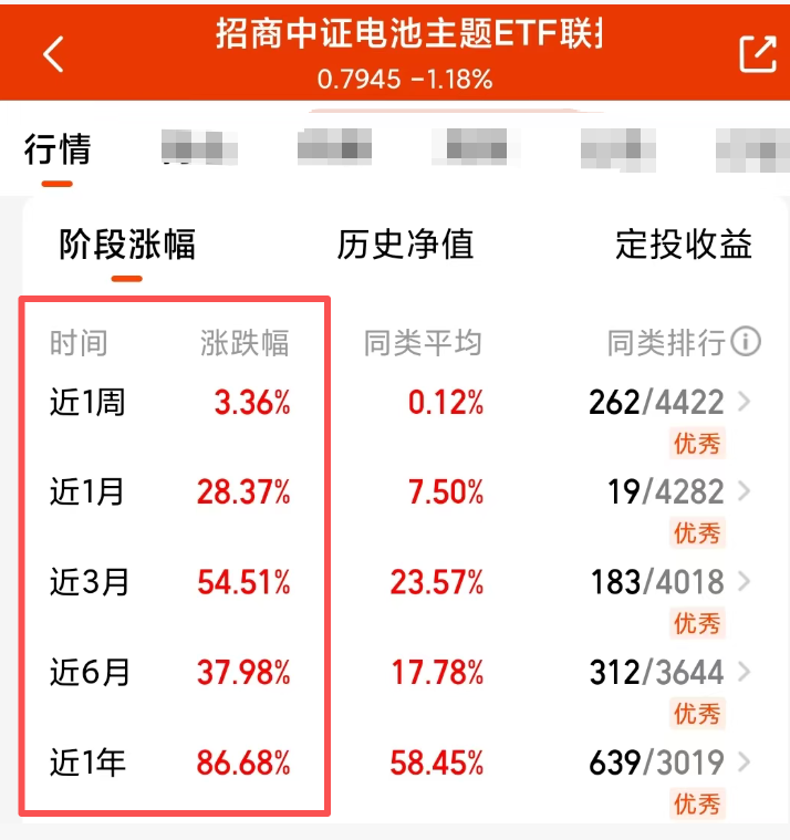 马上就是小长假大家节前都准备配置什么呀~我看$招商中证电池主题ETF联接C(OTCFUND|016020)$这个电池赛道基指数中固态电池含量超四成,储能含量超六成,近1月收涨28.37%,近1年收涨86.68%,各个时间维度业绩跑赢同类产品基准还是蛮不错的~趁着今天回调准备入场了~