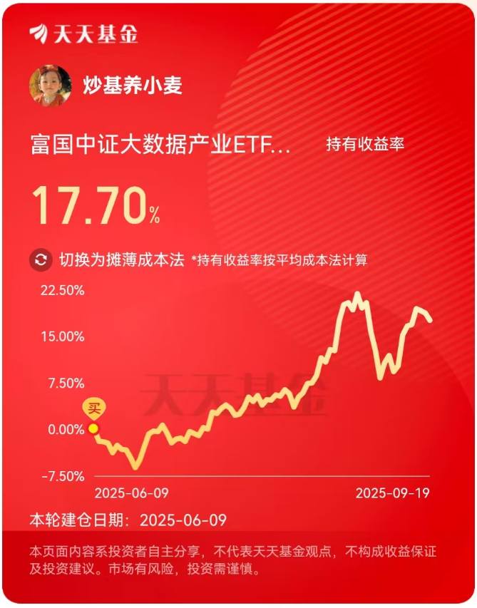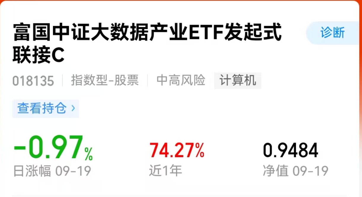 麦爸看了看持有的$富国中证大数据产业ETF发起式联接C(OTCFUND|018135)$也跟着发力,半天就涨2.52%,目前收益率都干到17.7%+了!为啥这么牛?看持仓就懂,中科曙光、科大讯飞这些重仓股,全是今天涨得欢的科技股。反观旅游酒店、化肥那些板块就蔫了,还好这只基不沾边。