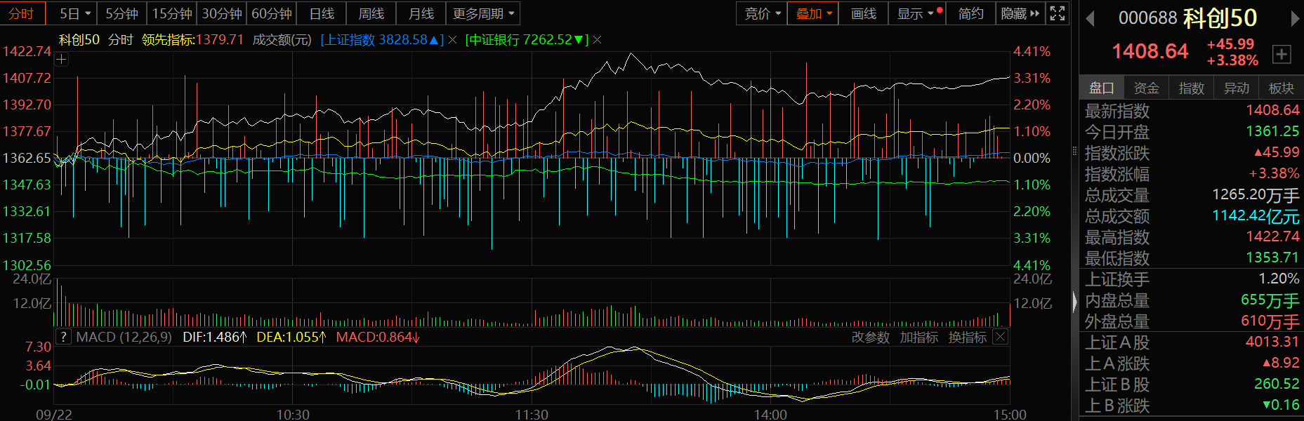 继续上演“科技吃肉,金融杀跌”的剧本!科创50代表的科技指数今天大涨3.38%,市场另一边的银行下跌1.01%。