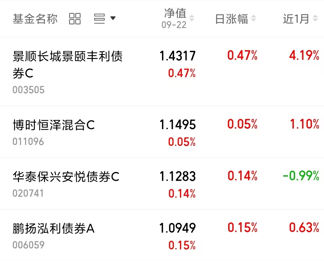 咱就说昨天大家都收了多少蛋呀,目前震荡行情还是看稳健属性的固收+比较靠谱,节前我准备先稳一波,等节后再说其他的咯,我看$景顺长城景颐丰利债券C(OTCFUND|003505)$昨天收涨47个蛋,这一波收蛋行情也太香了吧~而且近1个月收419个蛋,属实羡慕了~