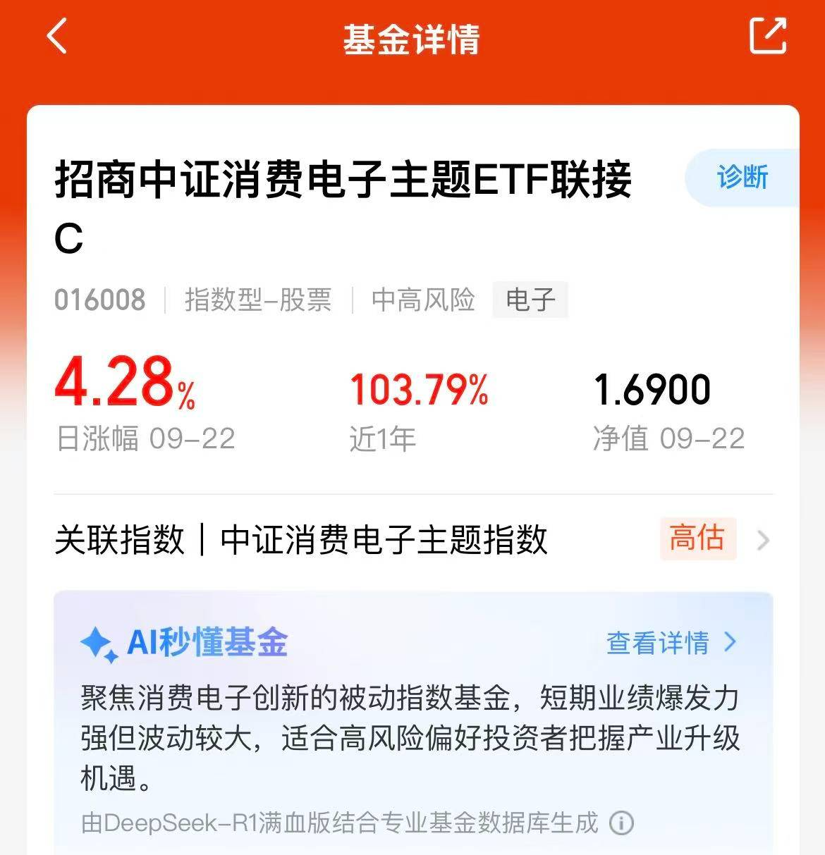行情震荡回调,大家也不用紧张呢,我觉得回调可以适当的补仓,国产芯片的技术的突破,对消费也是不错的利好,资金也开始进来消费电子板块了,$招商中证消费电子主题ETF联接C(OTCFUND|016008)$持仓涵盖立讯精密、歌尔股份等,都是龙头企业呢,年化收益率103.79%,业绩也是非常给力的,利好多多,比如英伟达巨资押注OpenAI,我觉得后续行情还有很大上涨空间,所以继续看好这个板块呢!