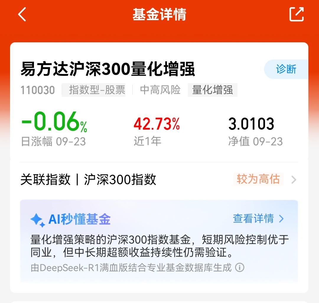 近期市场行情震荡不断,板块之间也在轮动,想要抓住当前热点趋势,真是难上加难,而此时均衡型的宽基指数,明显是不错的选择,$易方达沪深300量化增强(OTCFUND|110030)$运用量化增强策略,比沪深300指数涨幅还要更高,近一年涨幅42.73%,获取超额收益显著,我也打算开始定投起来了!