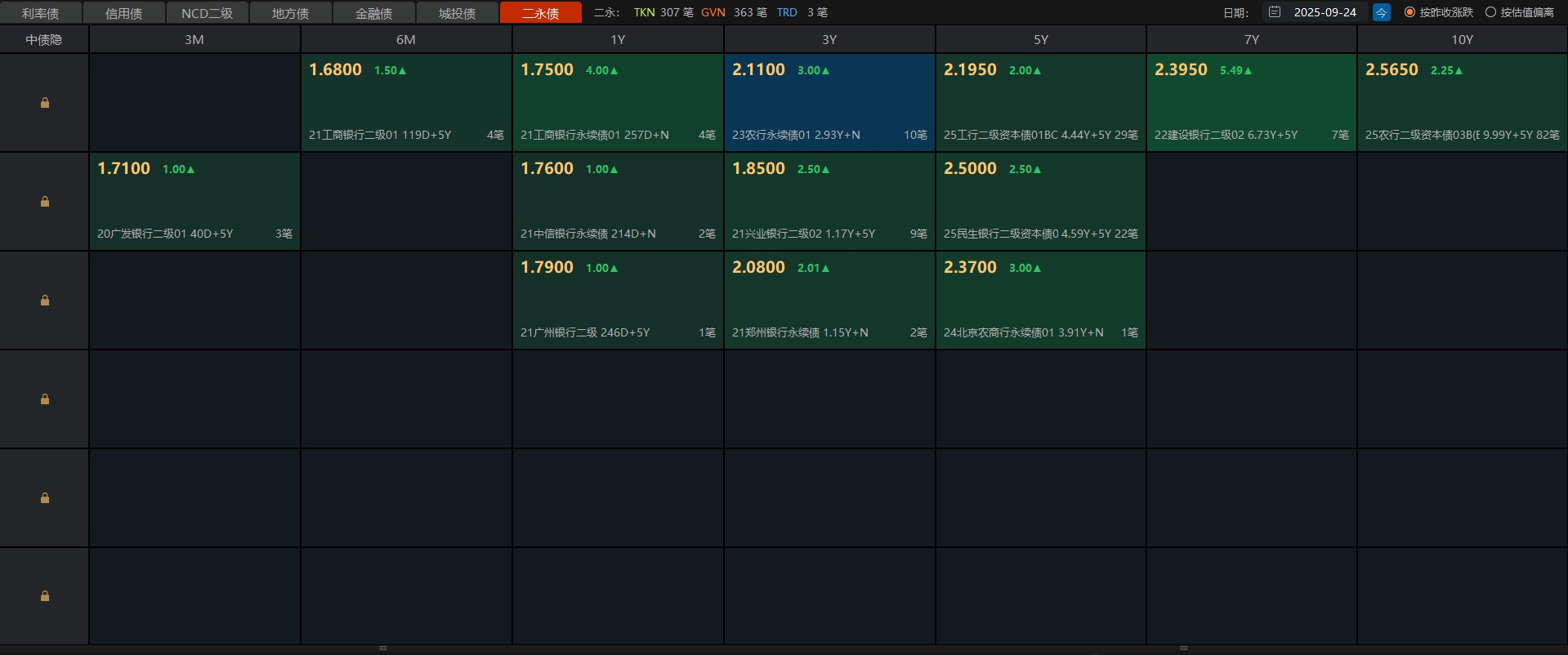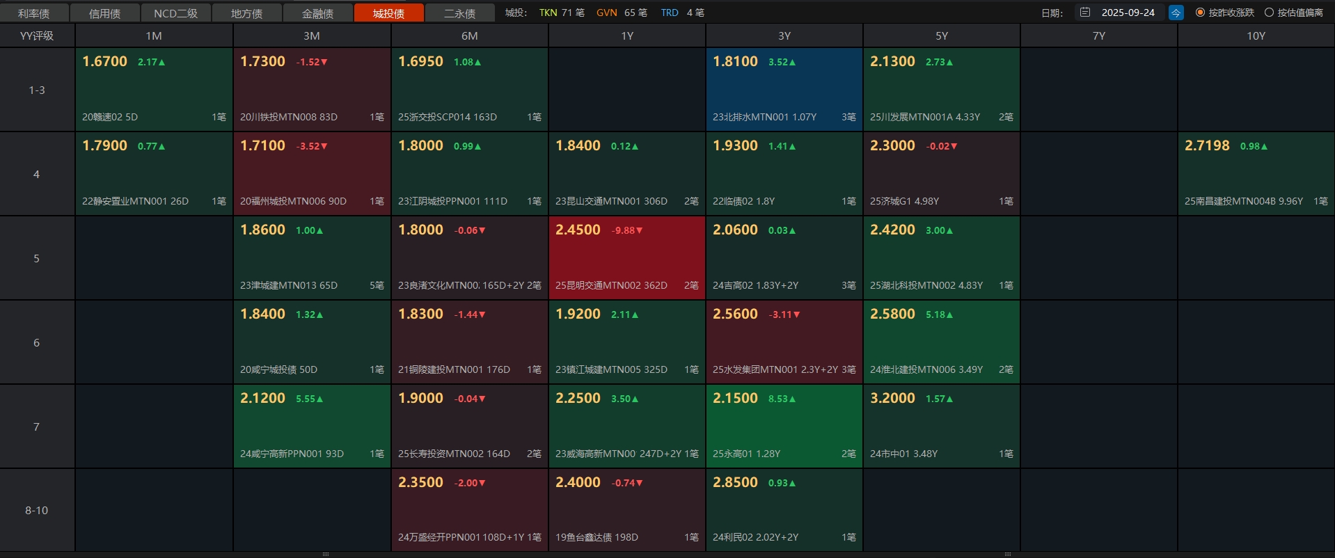 09月24日债市午间天气播报:上半场结束,半导体爆发,材料设备超10%涨幅,科创芯片涨幅超5%。可转债昨天补少了,指数涨幅超80个蛋,华宝已经超百蛋了。债市状态不佳,7-10年国开债碎3-5个,超长期国债轻仓碎蛋6-8(华子),重仓碎蛋9个左右(方正)