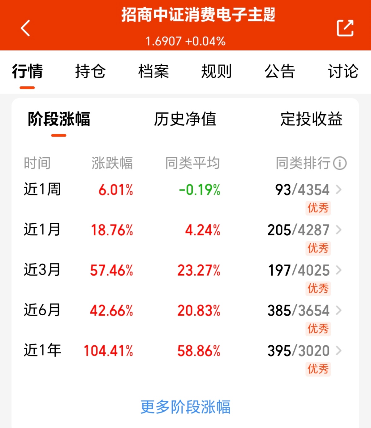 今日市场迎来反弹吃肉行情,但板块之间还是有所轮动,不过我发现近期资金开始抄底消费电子板块,就以$招商中证消费电子主题ETF联接C(OTCFUND|016008)$来说,持仓全面的覆盖了寒武纪、立讯精密、工业富联等前十大权重股,完美契合芯片、组装、终端产品全产业链,近一年更是涨幅高达104.41%,大幅度跑赢同类产品,而看其当前趋势仍然向好,我也打算分批上车起来了!