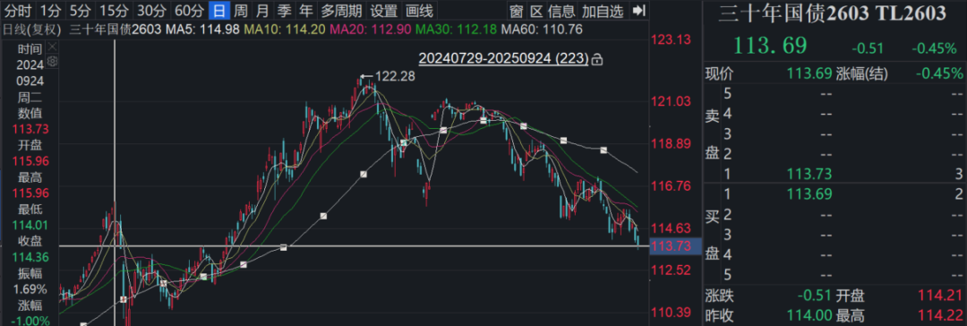 另外,今天,30年国债期货主力合约跌破114,跌穿了去年9月24日的低点,换句话说,30年国债,已经回到了0924这个原点。
