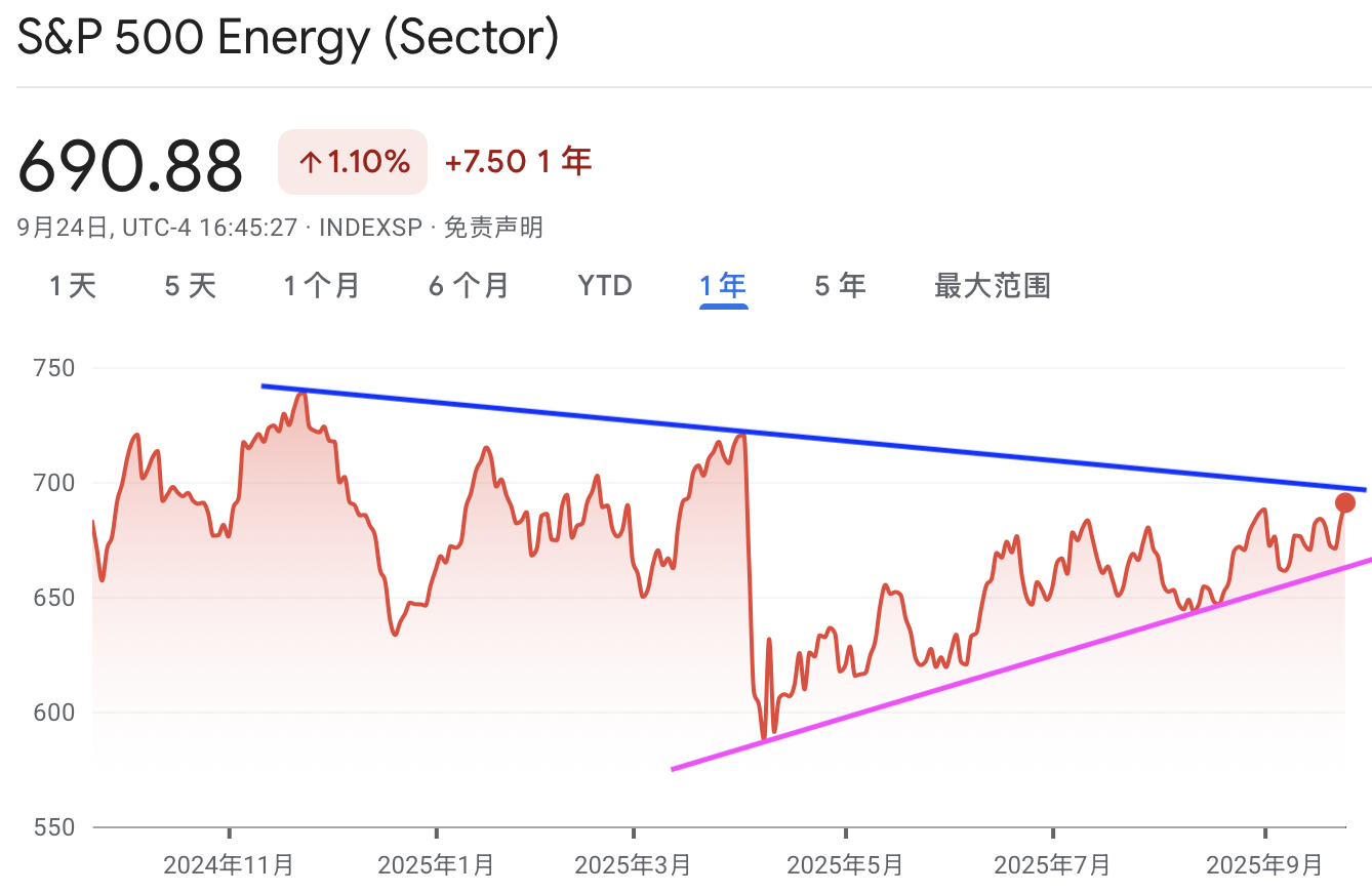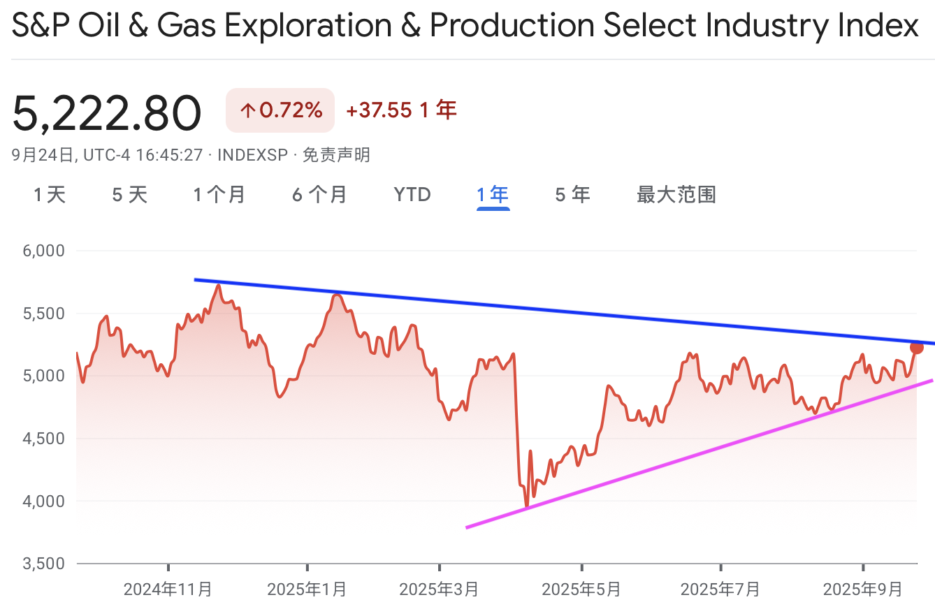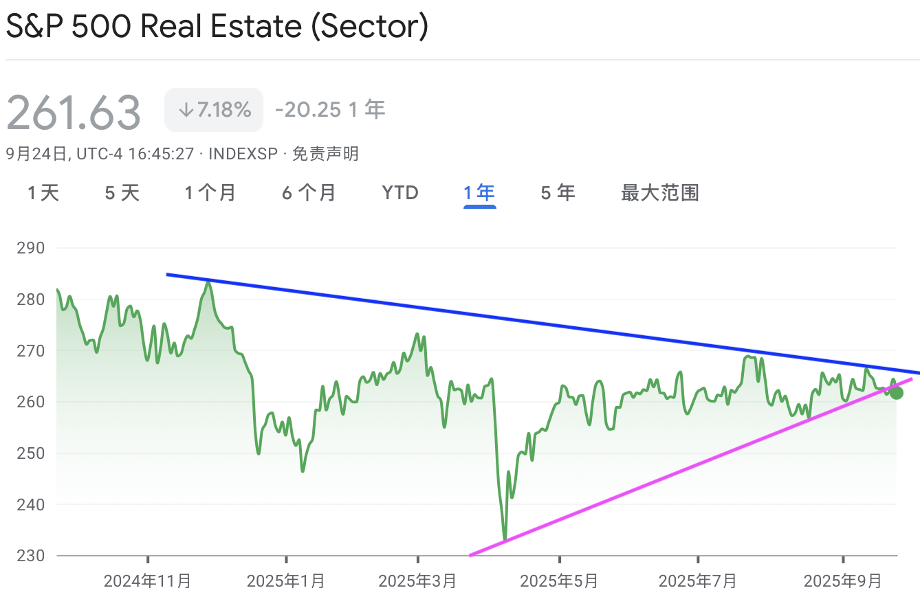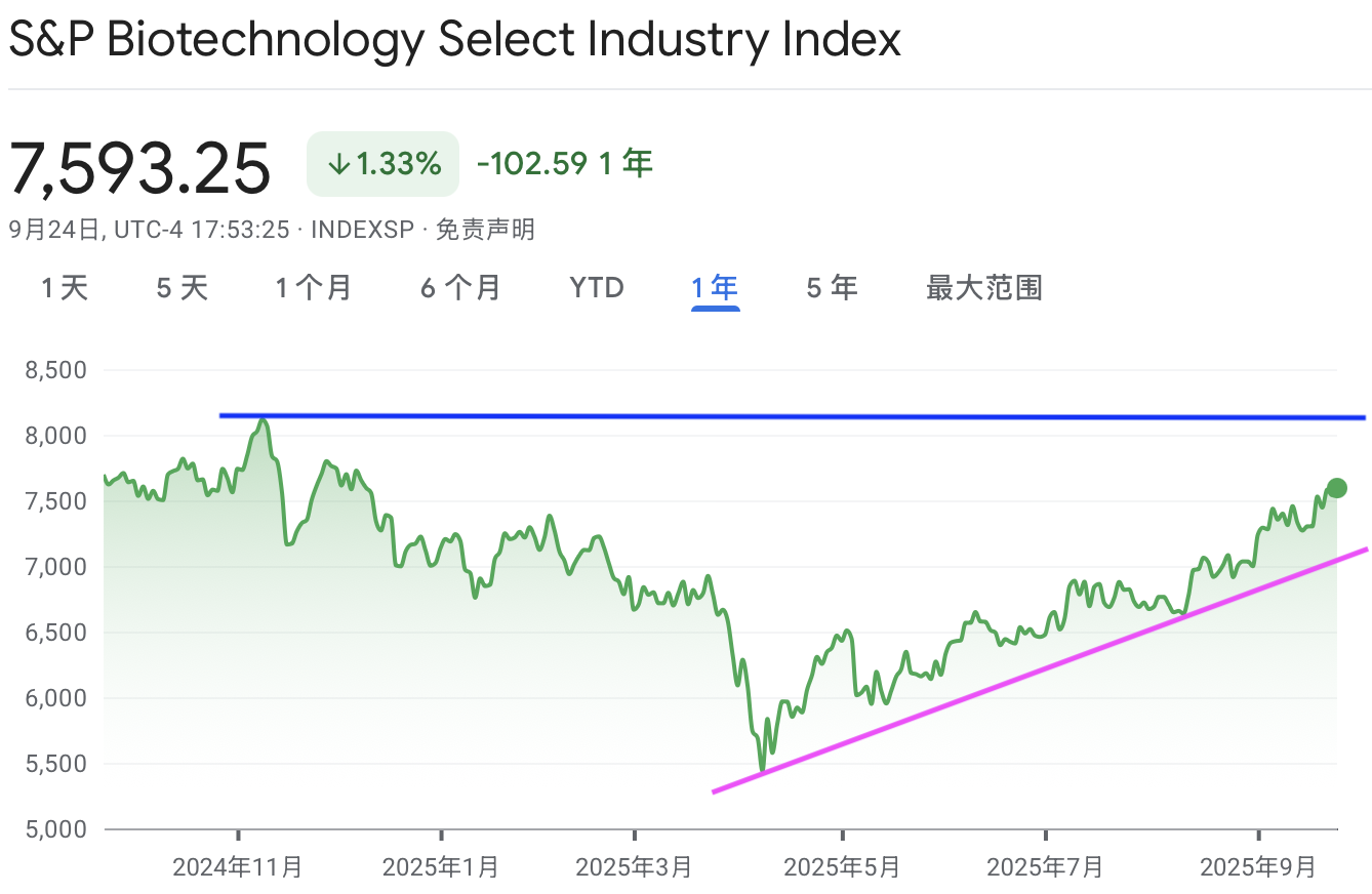 标普房地产最近陷入盘整期,形成对称三角形,最近一直在中间位置横盘震荡,后市方向不明。标普生物最近反转向上,目前强势上行中,距离压力位仍有一些上行空间。