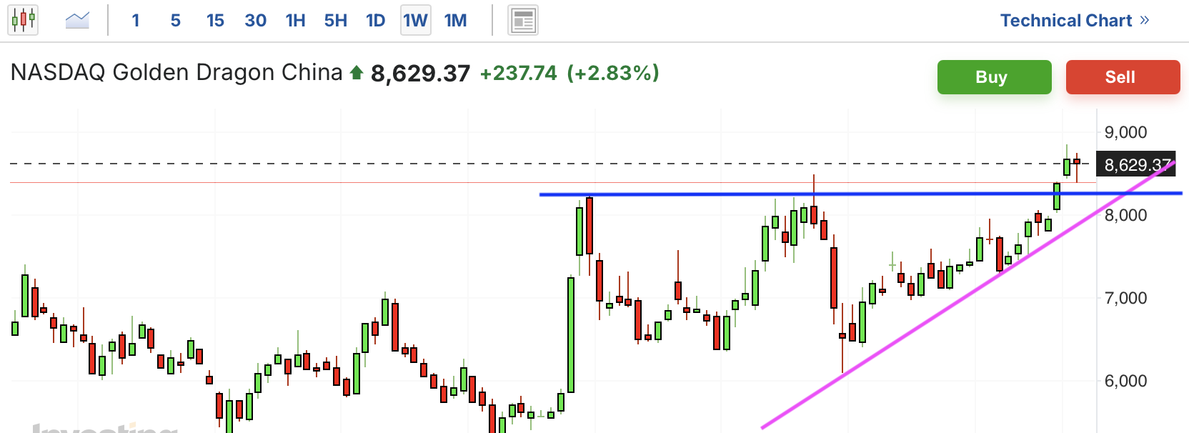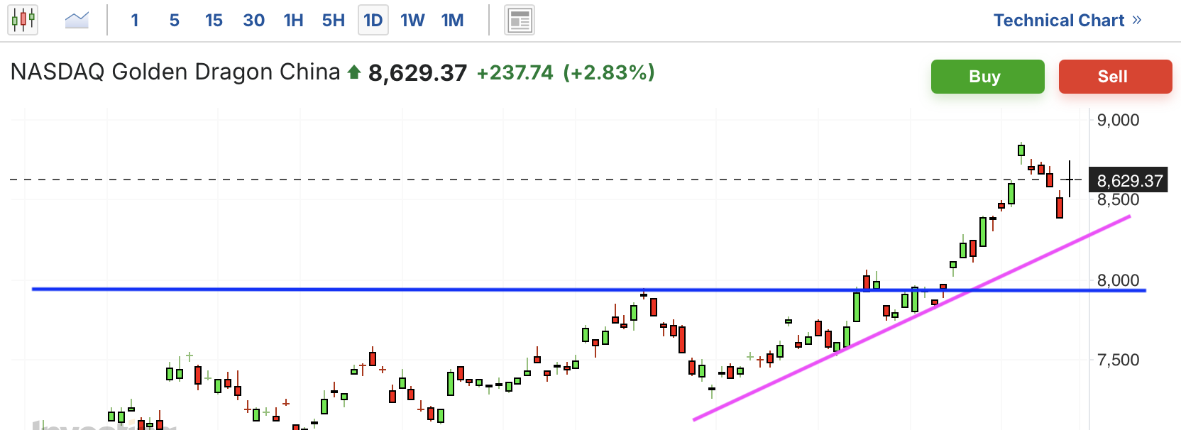 中概股此前长期盘整,最近拉升,突破关键压力位,趋势反转向上。然而,在上行途中受阻回落,好在今日大幅反弹,有止跌回升迹象。