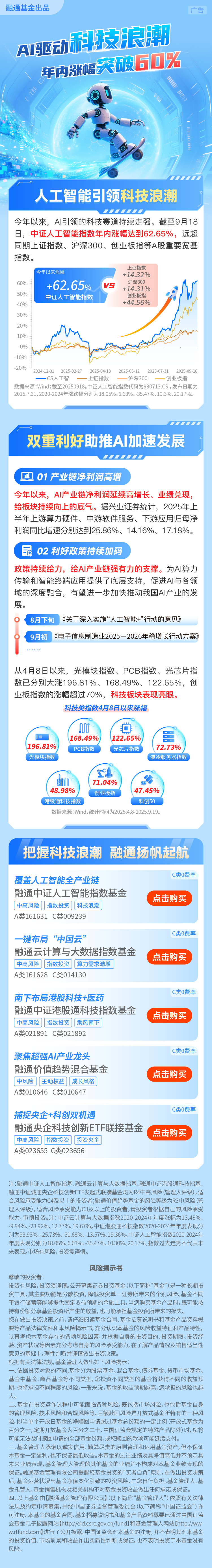 今年以来,AI引领的科技赛道持续走强。截至9月18日,中证人工智能指数年内涨幅达到62.65%,远超同期上证指数、沪深300、创业板指等A股重要宽基指数。把握科技浪潮,融通扬帆起航!