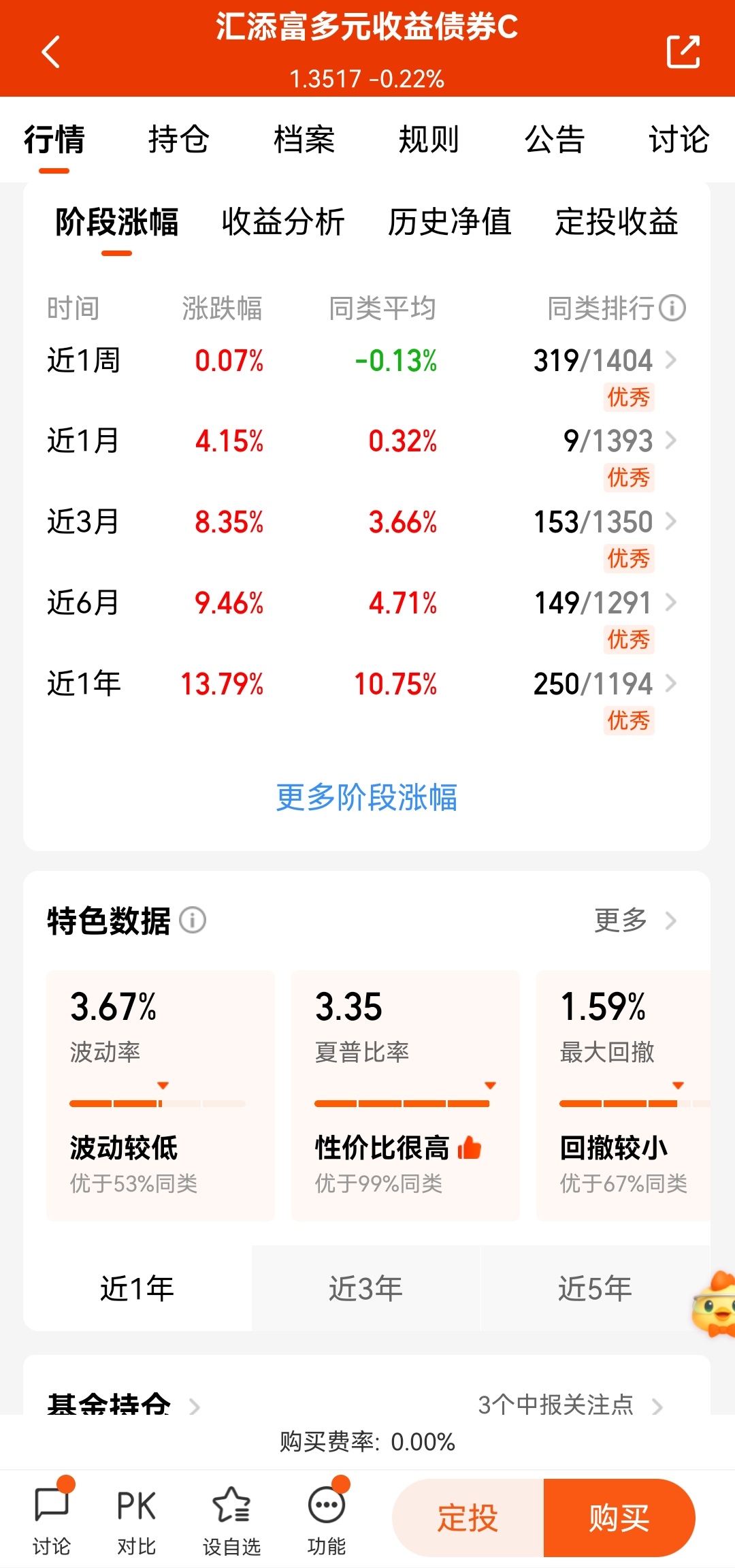 其中$汇添富多元收益债券C(OTCFUND|470011)$更是固收+中的“科技特种兵”,曾多次在股债震荡行情中逆势上涨!近一个月涨幅高达4.15%,近一年斩获了13.79%优异成绩,各个阶段的业绩排名都远远领先同类,持仓配置采用稳定债券作为底仓,并搭配了科技增强策略,提高整体收益率,从而获取超额收益显著!