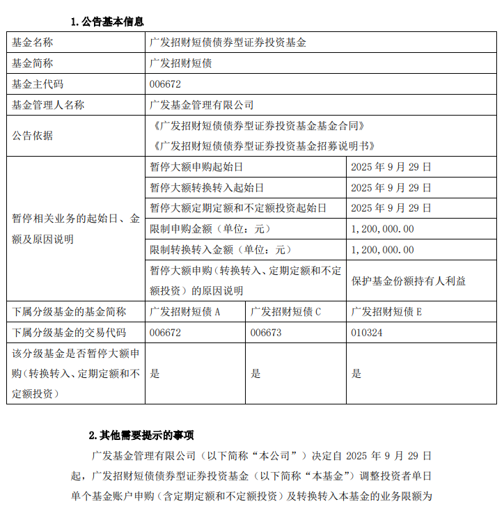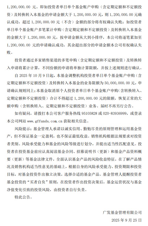 关于广发招财短债调整申购业务限额的公告