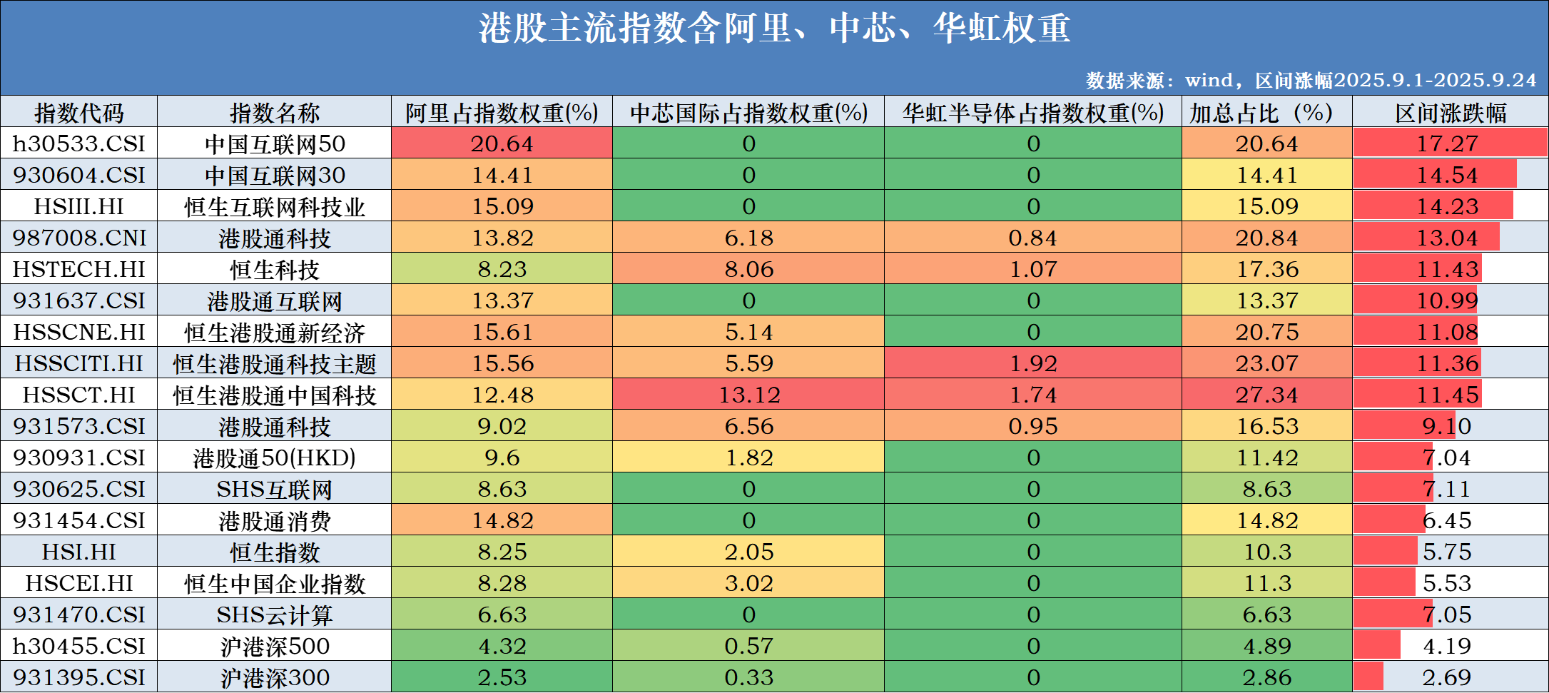 我对我之前做的那张神图做了一个更新,直接把美团剔除,看一下阿里、中芯国际、华虹半导体的加总占比(其实这里面应该也加上腾讯,但腾讯目前被认为是一个偏稳健的标的,阿里含量高的指数,腾讯含量也肯定不会低于阿里含量,也就是说只会高不会低)。