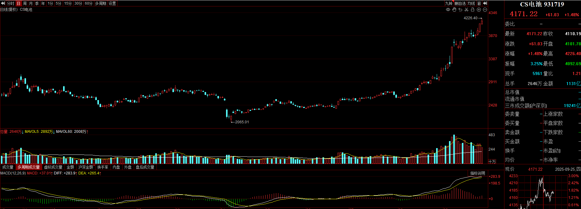 电池板块高开高走,指数涨超1.5%,附图MACD金叉向上,短期多头趋势完好,当下可以继续格局。