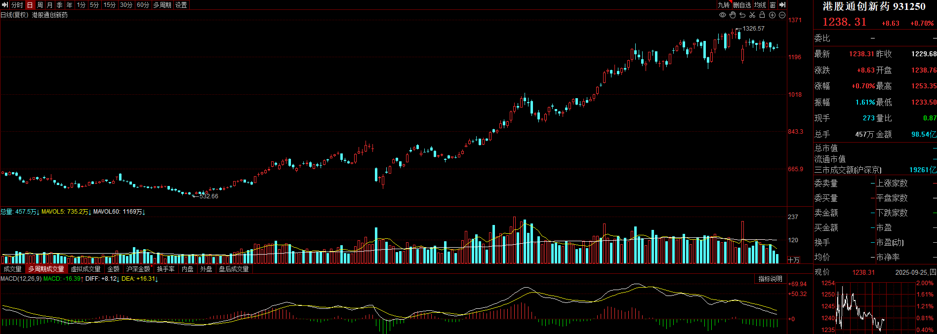 港股通创新药冲高回落,指数被5日均线压制,短期行情震荡,下方是5日均线压力,下方是60日均线支撑,在行情没有向上,或者向下突破时,我选择躺平观望了。
