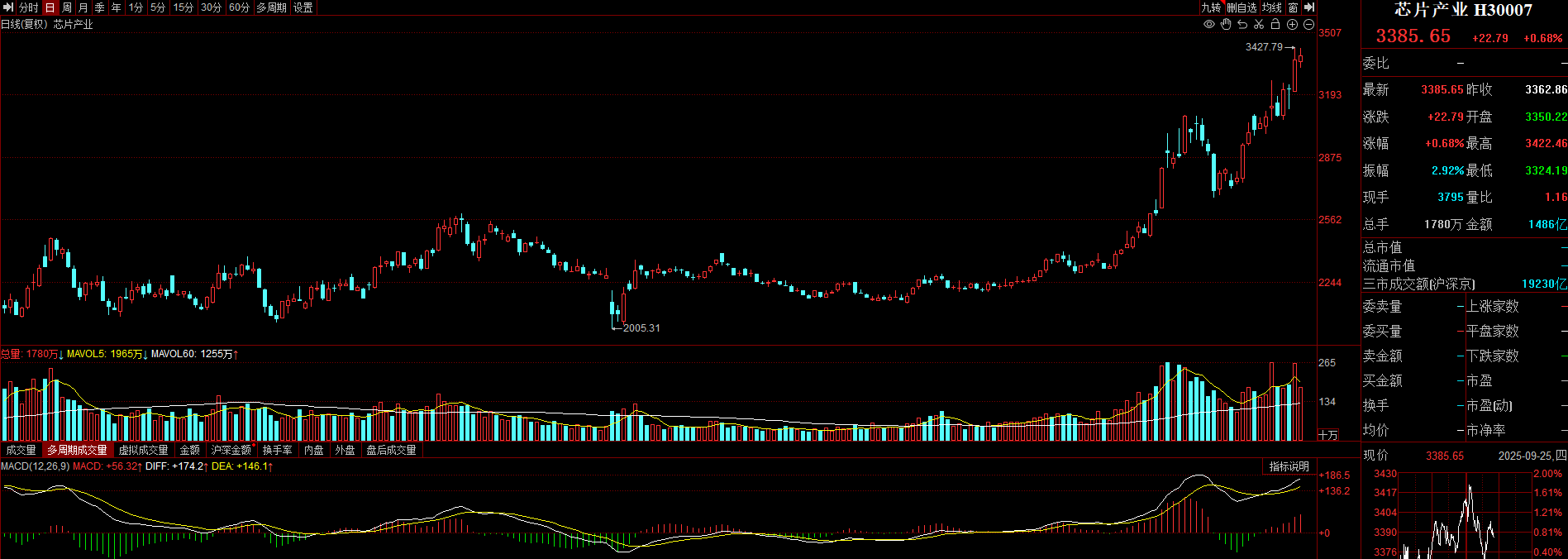 芯片产业高开高走,指数涨超1%,技术面上多头趋势完好,关注5日均线的支撑,只要这个支撑不破,就继续格局。