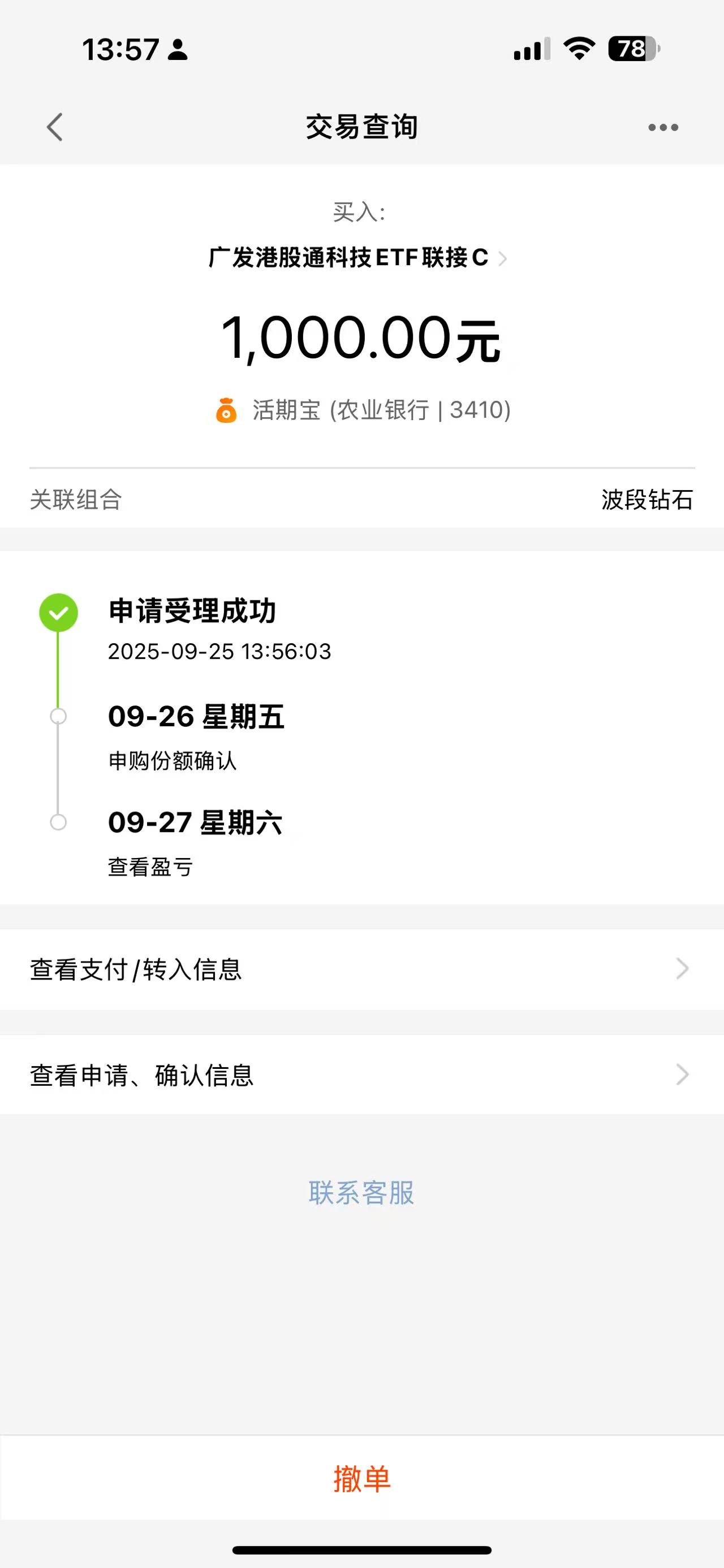 操作:买入1000元$广发港股通科技ETF联接C(OTCFUND|025198)$基金,该基金被动跟踪港股通科技ETF指数,该指数成分股集中度高,其中腾讯、小米、阿里巴巴的持仓占比均超过15%,比传统的恒生科技指数更纯粹地聚焦于互联网、半导体、新能源车、云计算等TMT赛道,能更有效地捕捉科技主线的增长红利。今年科技牛以来,A股科技市场已经涨上天了,而港股通科技这边估值相对较低,但这并不改变它的吸金能力。截至9月23日,今年南向资金净买入额已超1.1万亿港元,创下历史新高,显示出内地资金对港股科技龙头长期价值的认可,在美联储降息周期的背景下,在A股科技牛轮番上阵的惯性下,我相信港股通科技还有待爆发。