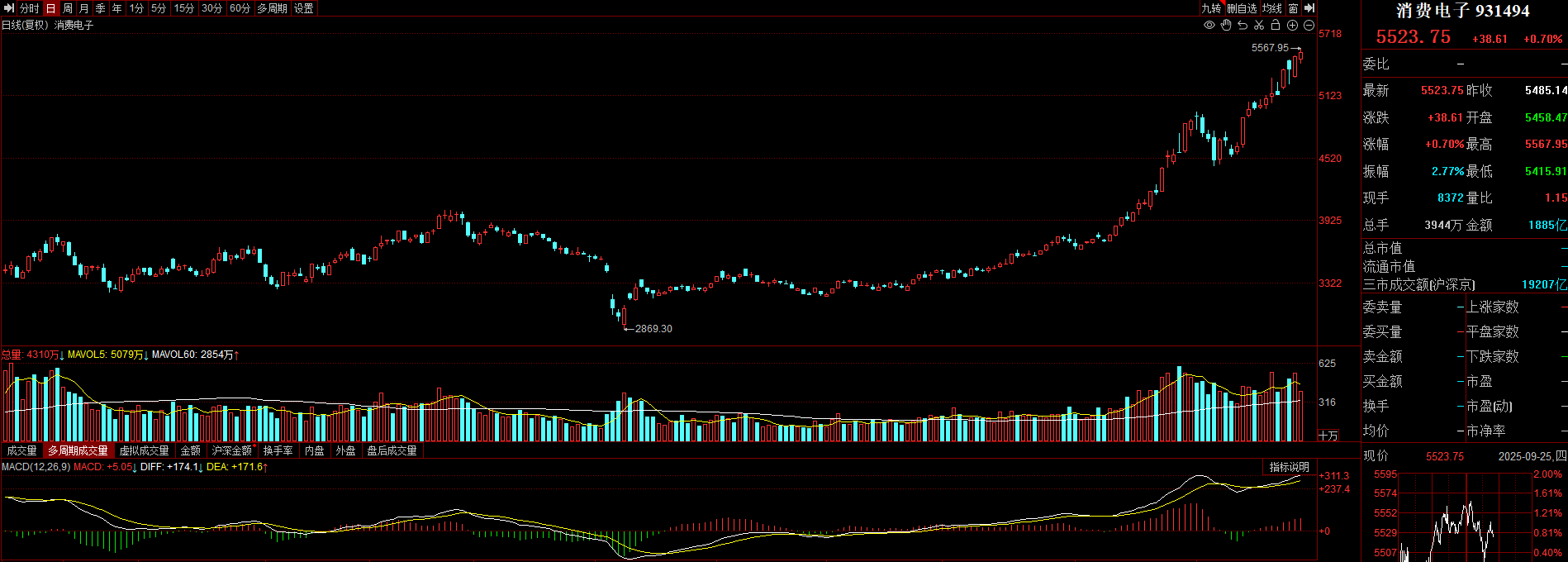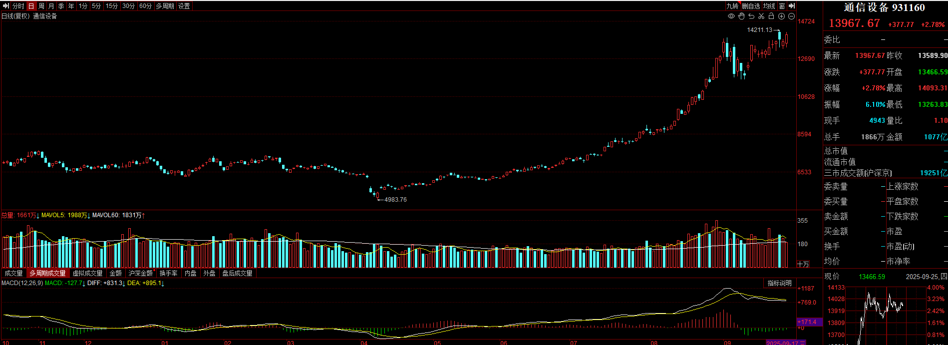 通信设备又拉升了,指数涨超3%,一根中阳线站上5日均线的支撑,短期多头趋势完好,当下可以继续格局。