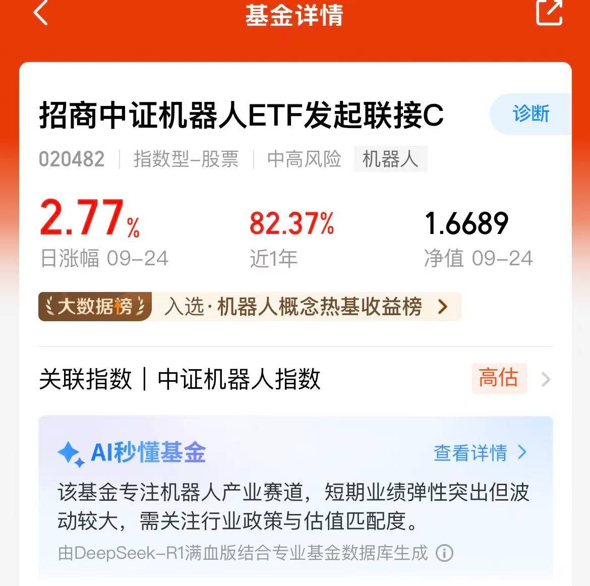 今天A股低开高走,目前拉升的不错呢,机器人继续上涨啦,$招商中证机器人ETF发起联接C(OTCFUND|020482)$目前估值上涨1%,近一个月涨幅8.5%,近三个月涨幅30.21%,近一年涨幅82.37%,业绩优秀,盈利强,这是高度聚焦机器人产业的,后续马斯克自己也会经常放出“利好”,催化会不断,机器人前景是不错的呢!