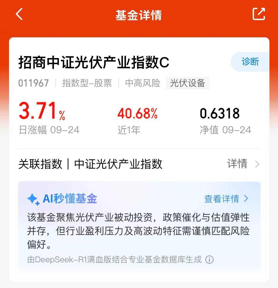 今天大盘震荡走高,目前三大指数均拉升了,盘面是比较不错的,光伏方向也继续上涨啦,这已经是连涨3了哟,$招商中证光伏产业指数C(OTCFUND|011967)$近一个月涨幅13.19%,近三个月涨幅38.95%,业绩不错呢,在光伏反内卷政策影响下,未来可期,我觉得还有很大上涨空间,所以我也打算逢低布局啦!