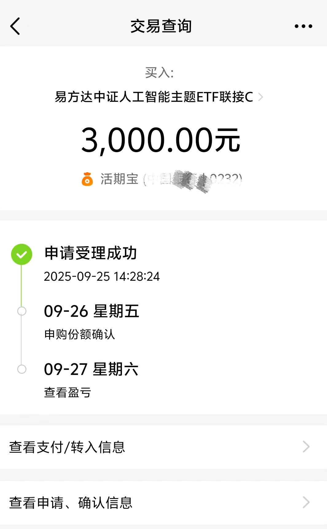 大盘今天继续上涨,人工智能板块今天领涨,之前深度调整之后,目前估值已经回归正常了,国务院人工智能+”行动政策利好之下,人工智能会是全年的行情主线。$易方达中证人工智能主题ETF联接C(OTCFUND|012734)$持仓人工智能全产业链,近一月涨了15.20%,近三个月涨了59.44%,近一年涨了123.59%,长期看好这个方向,今天加仓3000元!