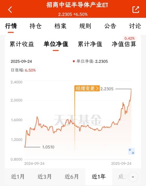 我一直关注的$招商中证半导体产业ETF发起式联接C(OTCFUND|020465)$表现突出,单日涨幅6.5%,近一个月上涨23.2%,近一年收益率达112.23%,显著领先同类产品。随着行业景气度持续提升,半导体全产业链轮动上涨趋势明显,今天看着有所调整,不过已经拉升上来了,跌不下去,不等了,上车!