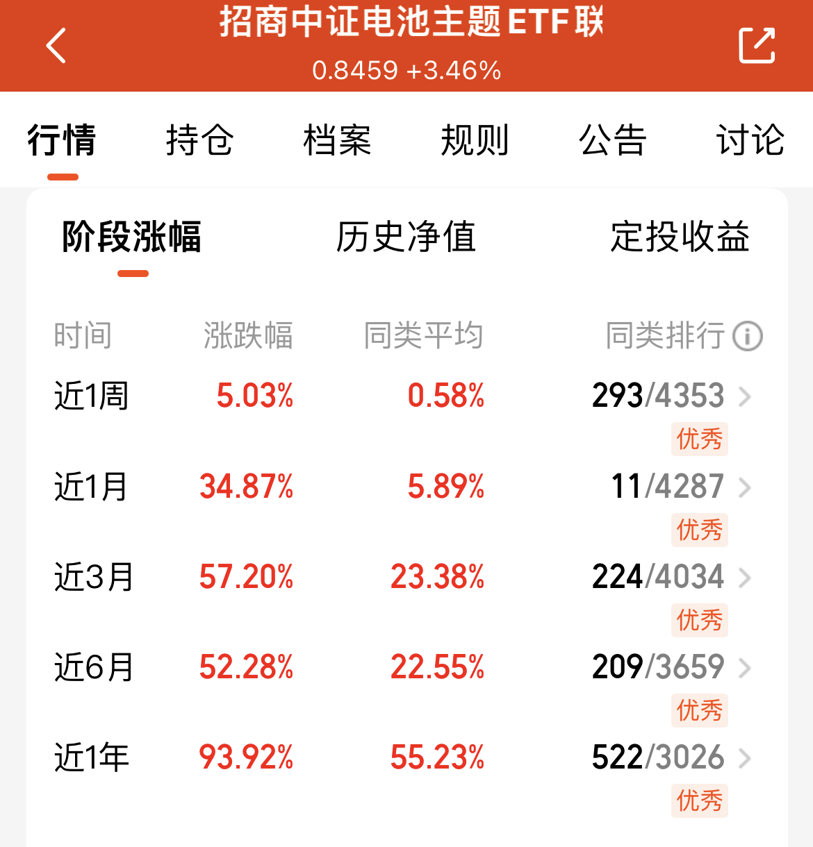 电池赛道最近利好扎堆,$招商中证电池主题ETF联接C(OTCFUND|016020)$的表现和持仓太能打!近一月涨34.87%、近三月超57%,涨势够猛;更关键是持仓精准,固态电池占比超四成、储能占比超六成,核心板块扎得深。
