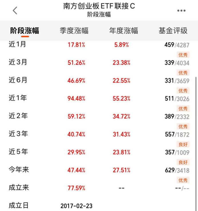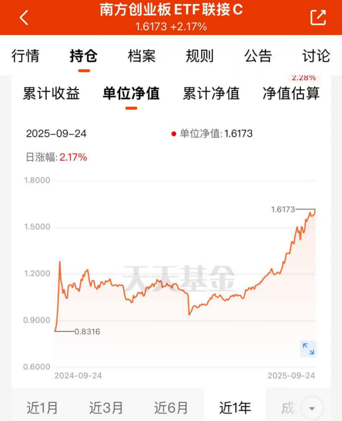 不过话说回来,普通投资者想抓这波围绕创业板指的机会,其实挺难的——选个股不仅门槛高,还容易踩雷,怎么高效把握呢?我给大家提个思路,就是盯着跟踪创业板指数的产品,比如南方创业板ETF联接C,A类代码002656,C类是004343。它的逻辑特别简单,就是帮你一键“打包”创业板的核心资产,不用你费心费力去挑个股,直接分享整个指数的增长红利。昨日上涨2.17%,单位净值达到1.6173再创近1年新高!