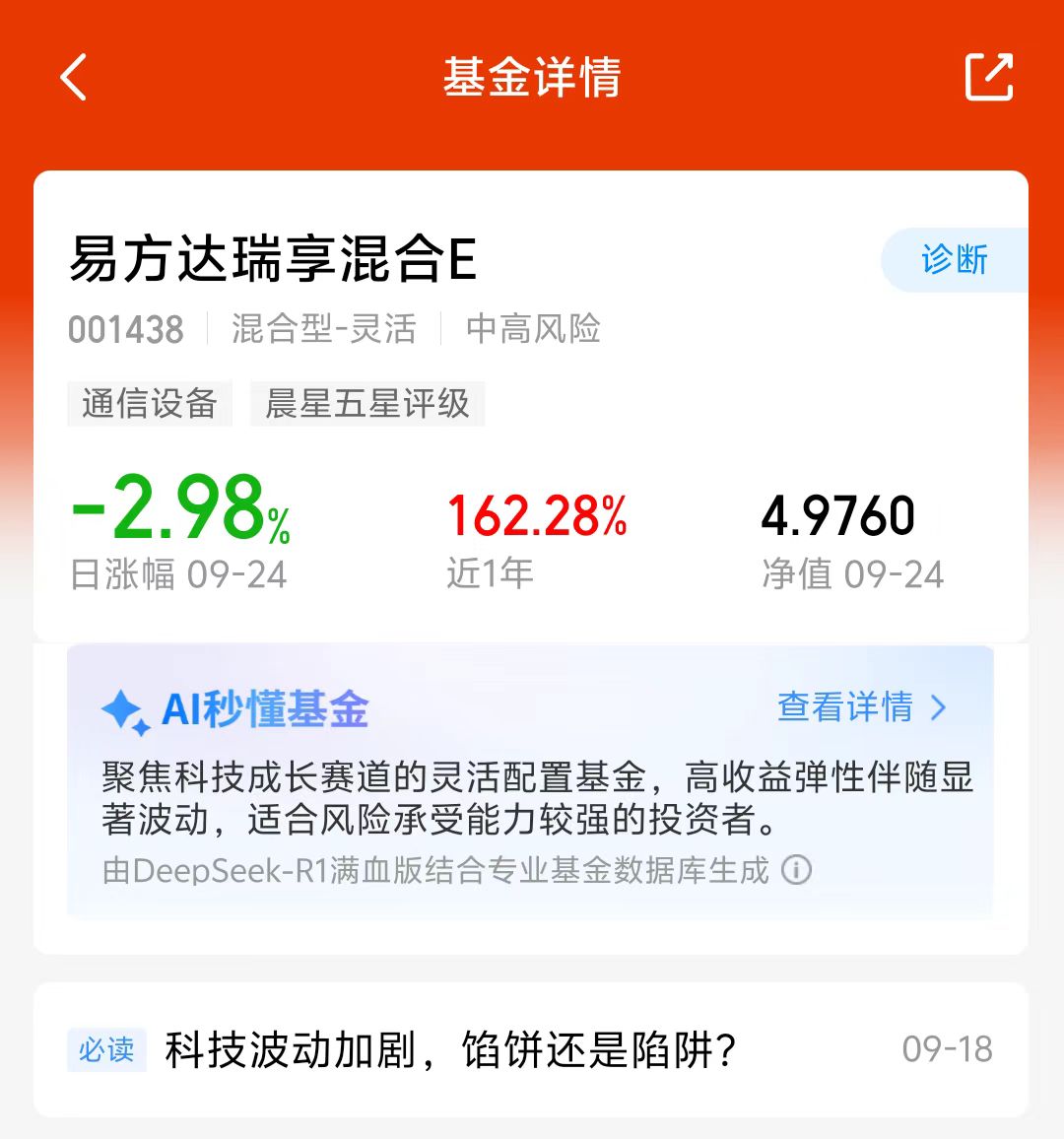 大盘今天涨了不少,大科技板块表现不错,CPO今天也涨起来了,$易方达瑞享混合E(OTCFUND|001438)$近三个月涨了74.09%,近六个月涨了100.69%,近一年涨了162.28%,是经理的代表作,成立以来涨幅397.60%,过往经理调仓很坚定,看好经理操作,我准备上车了!